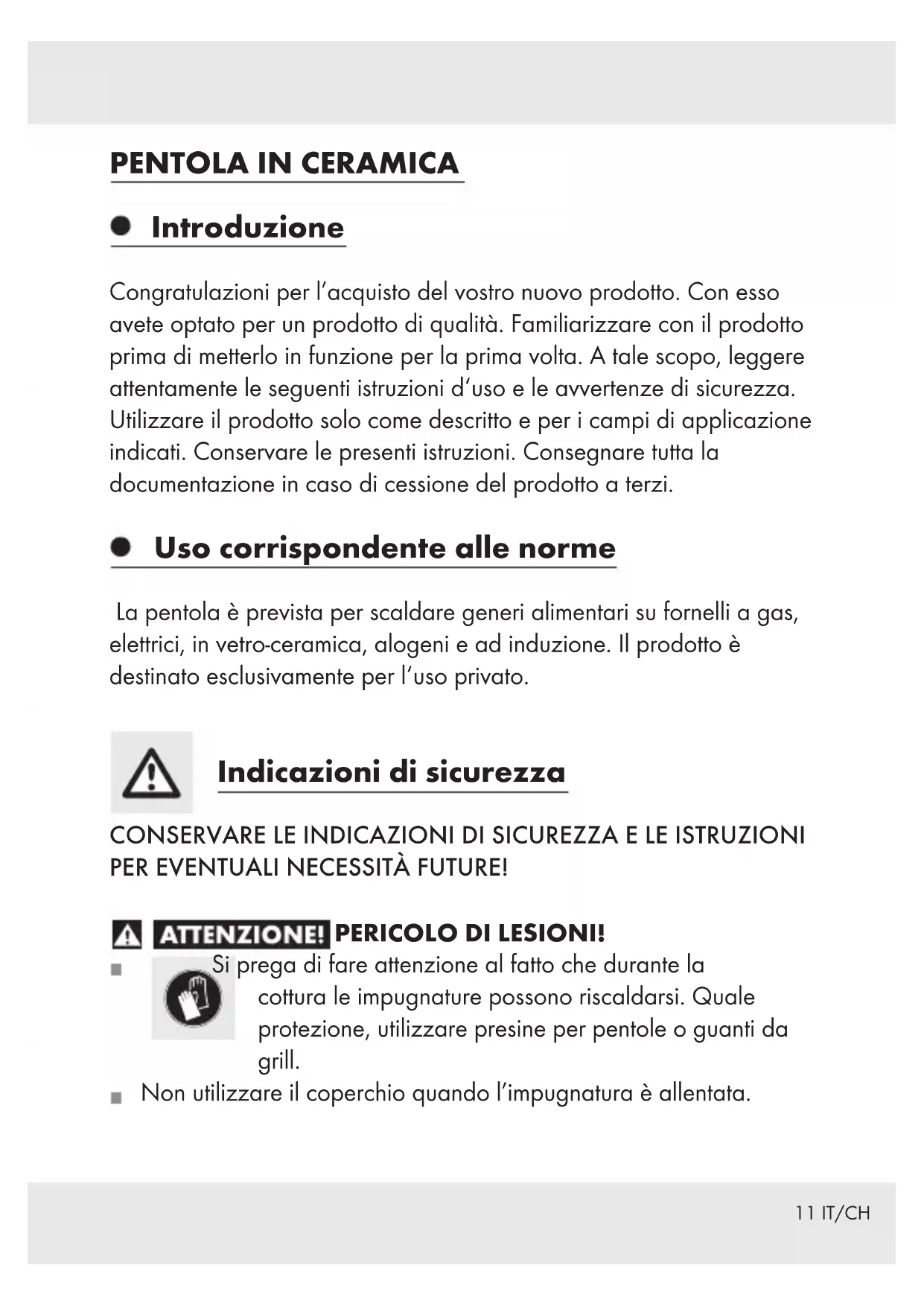 Introduzione Congratulazioni per l’acquisto del vostro nuovo prodotto. Con esso avete optato per un prodotto di qualità. Familiarizzare con il prodotto prima di metterlo in funzione per la prima volta. A tale scopo, leggere attentamente le seguenti istruzioni d‘uso e le avvertenze di sicurezza. Utilizzare il prodotto solo come descritto e per i campi di applicazione indicati. Conservare le presenti istruzioni. Consegnare tutta la documentazione in caso di cessione del prodotto a terzi. Uso corrispondente alle norme La pentola è prevista per scaldare generi alimentari su fornelli a gas, elettrici, in vetro-ceramica, alogeni e ad induzione. Il prodotto è destinato esclusivamente per l‘uso privato. Indicazioni di sicurezza CONSERVARE LE INDICAZIONI DI SICUREZZA E LE ISTRUZIONI PER EVENTUALI NECESSITÀ FUTURE! PERICOLO DI LESIONI! Si prega di fare attenzione al fatto che durante la cottura le impugnature possono riscaldarsi. Quale protezione, utilizzare presine per pentole o guanti da grill. Non utilizzare il coperchio quando l’impugnatura è allentata.12 IT/CH PERICOLO DI DANNI A COSE! Durante la cottura è estremamente importante non perdere di vista pentole e padelle nelle quali viene riscaldato del grasso. Infatti il grasso si può velocemente surriscaldare e prendere fuoco. Qualora il grasso dovesse prendere fuoco, non spegnere mai il fuoco con acqua! Soffocare le fiamme con il coperchio di una pentola o con una spessa coperta di lana. Per non danneggiare il rivestimento antiaderenza utilizzare solamente utensili per cucina in plastica resistente al calore o in legno. Non tagliare il cibo direttamente nella pentola. Non porre carne bagnata nel grasso caldo. Il grasso che sprizza su una piastra da cucina incandescente può facilmente generare un incendio. Le alte temperature possono scolorire la parte esterna del prodotto. Questo non indica un difetto nel materiale, né compromette la qualità o il funzionamento del prodotto. Scegliere la piastra di cottura corrispondente al diametro del fondo della pentola, e ciò al fine di evitare una perdita di calore. L’articolo è previsto per tenere caldi alimenti nel forno (massimo di 150 °C per 1 ora). Mai tenere il prodotto bollente sotto l’acqua corrente fredda. Il lato inferiore del prodotto potrebbe danneggiarsi o staccarsi. Il prodotto è adatto ad essere lavato in una lavastoviglie. Pulire frequentemente con detergenti aggressivi può danneggiare il prodotto e causarne lo scolorimento. La pulizia nella lavastoviglie può portare allo scolorimento delle parti in alluminio. ATTENZIONE! Il coperchio di vetro è fragile / non resistente agli urti.13 IT/CH Durante il risciacquo ad acqua, pulire la pentola con acqua calda e detergente comunemente reperibile in commercio. Evitare l’utilizzo di oggetti affilati e appuntiti per non danneggiare il materiale. Non tirare o spingere il tegame su fornelli alogeni o in vetroceramica. In caso di mancata osservanza, si può giungere a danneggiamenti dovuti a graffi. Si prega di notare che l’utilizzo di questo prodotto potrebbe comportare una leggera decolorazione del rivestimento brillante. Questo effetto è da considerarsi come un segno di utilizzo e non pregiudica in alcun modo la qualità del rivestimento e l’idoneità del prodotto allo scopo preposto. P Nota per i piani cottura a induzione J Nota: in determinate condizioni può verificarsi un rumore derivante dalle proprietà elettromagnetiche della fonte di calore e della pentola / padella. J Questo è del tutto normale e non implica danni al vostro piano cottura a induzione o alle pentole. J Mettere la pentola / padella al centro della piastra a induzione. J ATTENZIONE! Alto tasso di riscaldamento! Non surriscaldare le pentole durante il preriscaldamento. J Il locale deve essere ventilato bene nel caso di un surriscaldamento delle pentole. Utilizzo Prima di utilizzare la pentola per la prima volta si prega di rimuovere dall’articolo eventuali adesivi, e successivamente risciacquarlo con acqua calda.14 IT/CH Prima di utilizzare la pentola per la prima volta, fare bollire dell’acqua per due o tre volte nella padella per rimuovere completamente eventuali residui di produzione. Non surriscaldare una pentola vuota o contenente alimenti fritti, in quanto ciò potrebbe annullare l’effetto antiaderente e danneg giare il rivestimento. Smaltimento L’imballaggio è costituito di materiali ecologici che si possono smaltire nei punti di raccolta per riciclaggio locali. Informazioni sulle possibilità di smaltimento del prodotto consumato sono reperibili dall‘amministrazione comunale o cittadina.IAN 275732 IAN 275733 OWIM GmbH & Co. KG Stiftsbergstraße 1 D-74167 Neckarsulm IAN Model Pot size Effective bottom size Version 275732 HG00772 Ø200 mm Ø140 mm 03/2016 275733 HG00773 Ø240 mm Ø160 mm 03/2016