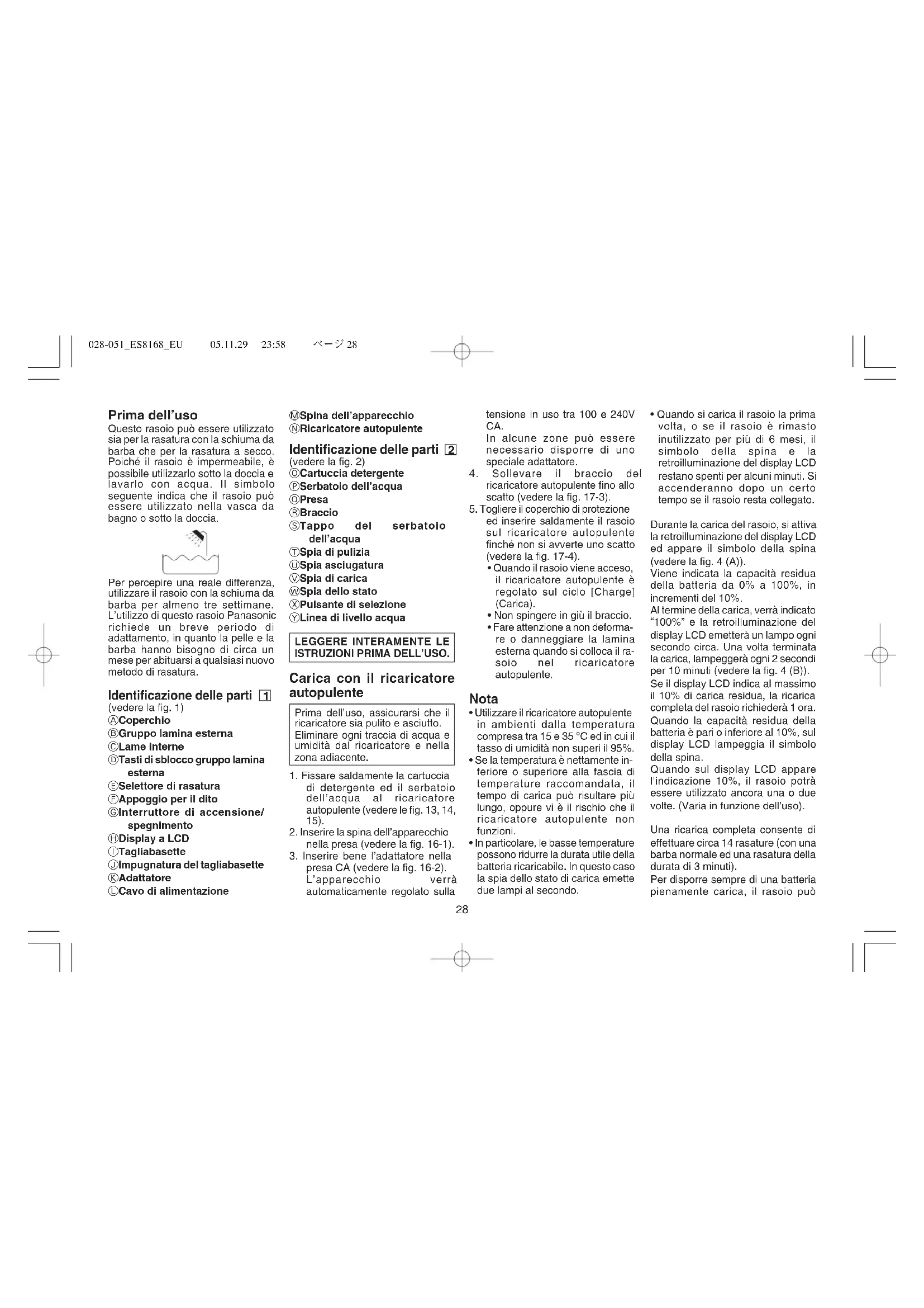 Prima dell’uso Questo rasoio può essere utilizzato sia per la rasatura con la schiuma da barba che per la rasatura a secco. Poiché il rasoio è impermeabile, è possibile utilizzarlo sotto la doccia e lavarlo con acqua. Il simbolo seguente indica che il rasoio può essere utilizzato nella vasca da bagno o sotto la doccia. Per percepire una reale differenza, utilizzare il rasoio con la schiuma da barba per almeno tre settimane. L’utilizzo di questo rasoio Panasonic richiede un breve periodo di adattamento, in quanto la pelle e la barba hanno bisogno di circa un mese per abituarsi a qualsiasi nuovo metodo di rasatura. Identificazione delle parti