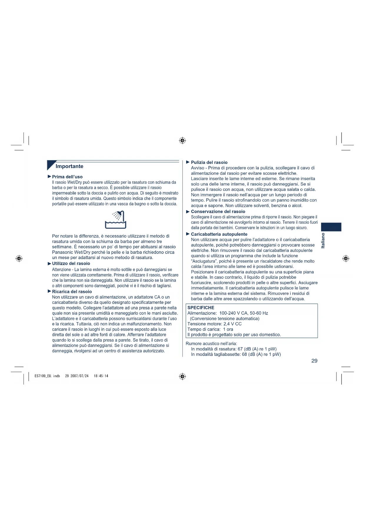ES7109_EU.indb 28 2007/07/24 18:45:1429 Italiano Importante Prima dell’uso Il rasoio Wet/Dry può essere utilizzato per la rasatura con schiuma da barba o per la rasatura a secco. È possibile utilizzare il rasoio impermeabile sotto la doccia e pulirlo con acqua. Di seguito è mostrato il simbolo di rasatura umida. Questo simbolo indica che il componente portatile può essere utilizzato in una vasca da bagno o sotto la doccia. Per notare la differenza, è necessario utilizzare il metodo di rasatura umida con la schiuma da barba per almeno tre settimane. È necessario un po’ di tempo per abituarsi al rasoio Panasonic Wet/Dry perché la pelle e la barba richiedono circa un mese per adattarsi al nuovo metodo di rasatura. Utilizzo del rasoio Attenzione - La lamina esterna è molto sottile e può danneggiarsi se non viene utilizzata correttamente. Prima di utilizzare il rasoio, vericare che la lamina non sia danneggiata. Non utilizzare il rasoio se la lamina o altri componenti sono danneggiati, poiché vi è il rischio di tagliarsi. Ricarica del rasoio Non utilizzare un cavo di alimentazione, un adattatore CA o un caricabatteria diverso da quello designato specicatamente per questo modello. Collegare l’adattatore ad una presa a parete nella quale non sia presente umidità e maneggiarlo con le mani asciutte. L’adattatore e il caricabatteria possono surriscaldarsi durante l’uso e la ricarica. Tuttavia, ciò non indica un malfunzionamento. Non caricare il rasoio in luoghi in cui può essere esposto alla luce diretta del sole o ad altre fonti di calore. Afferrare l’adattatore quando lo si scollega dalla presa a parete. Se tirato, il cavo di alimentazione può danneggiarsi. Se il cavo di alimentazione si danneggia, rivolgersi ad un centro di assistenza autorizzato.