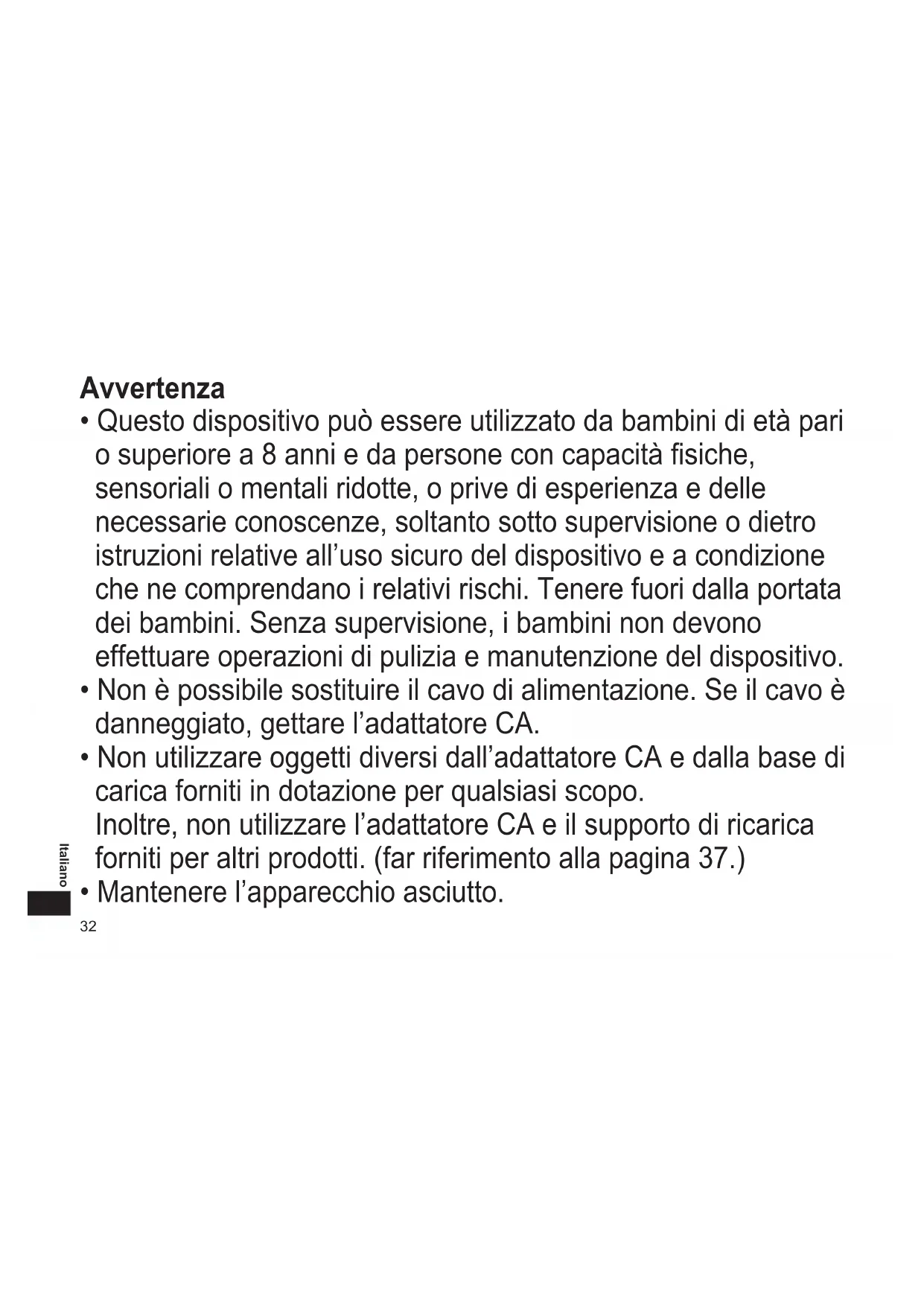 Altrimenti, si potrebbero causare scosse elettriche o lesioni.35 Italiano AVVERTENZA Pulire regolarmente la spina di alimentazione, la spina dell’apparecchio e la spina di ricarica per evitare l’accumulo di polvere