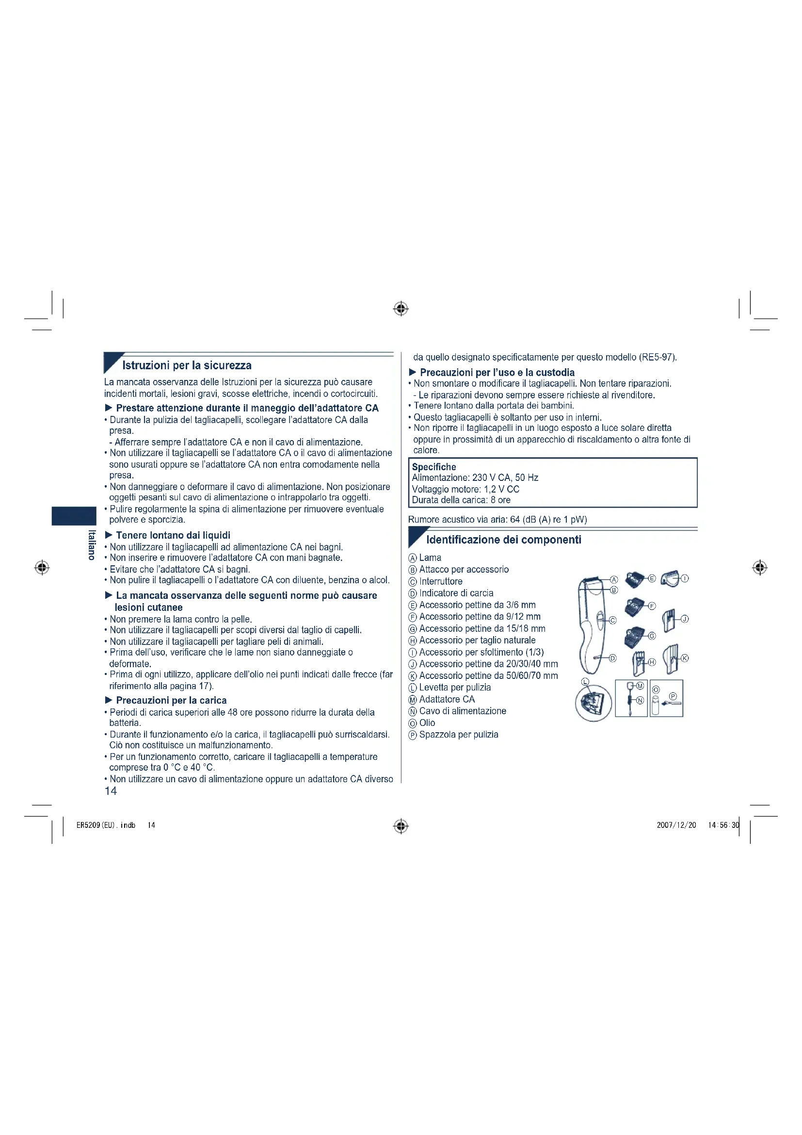 - Non riporre il tagliacapelli in un luogo esposto a luce solare diretta oppure in prossimità di un apparecchio di riscaldamento o altra fonte di calore. Speciche Alimentazione: 230 V CA, 50 Hz Voltaggio motore: 1,2 V CC Durata della carica: 8 ore Rumore acustico via aria: 64 (dB (A) re 1 pW) Identicazionedeicomponenti A Lama B Attacco per accessorio C Interruttore D Indicatore di carcia E Accessorio pettine da 3/6 mm F Accessorio pettine da 9/12 mm G Accessorio pettine da 15/18 mm H Accessorio per taglio naturale I Accessorio per sfoltimento (1/3) J Accessorio pettine da 20/30/40 mm K Accessorio pettine da 50/60/70 mm L Levetta per pulizia M Adattatore CA N Cavo di alimentazione O Olio P Spazzola per pulizia
