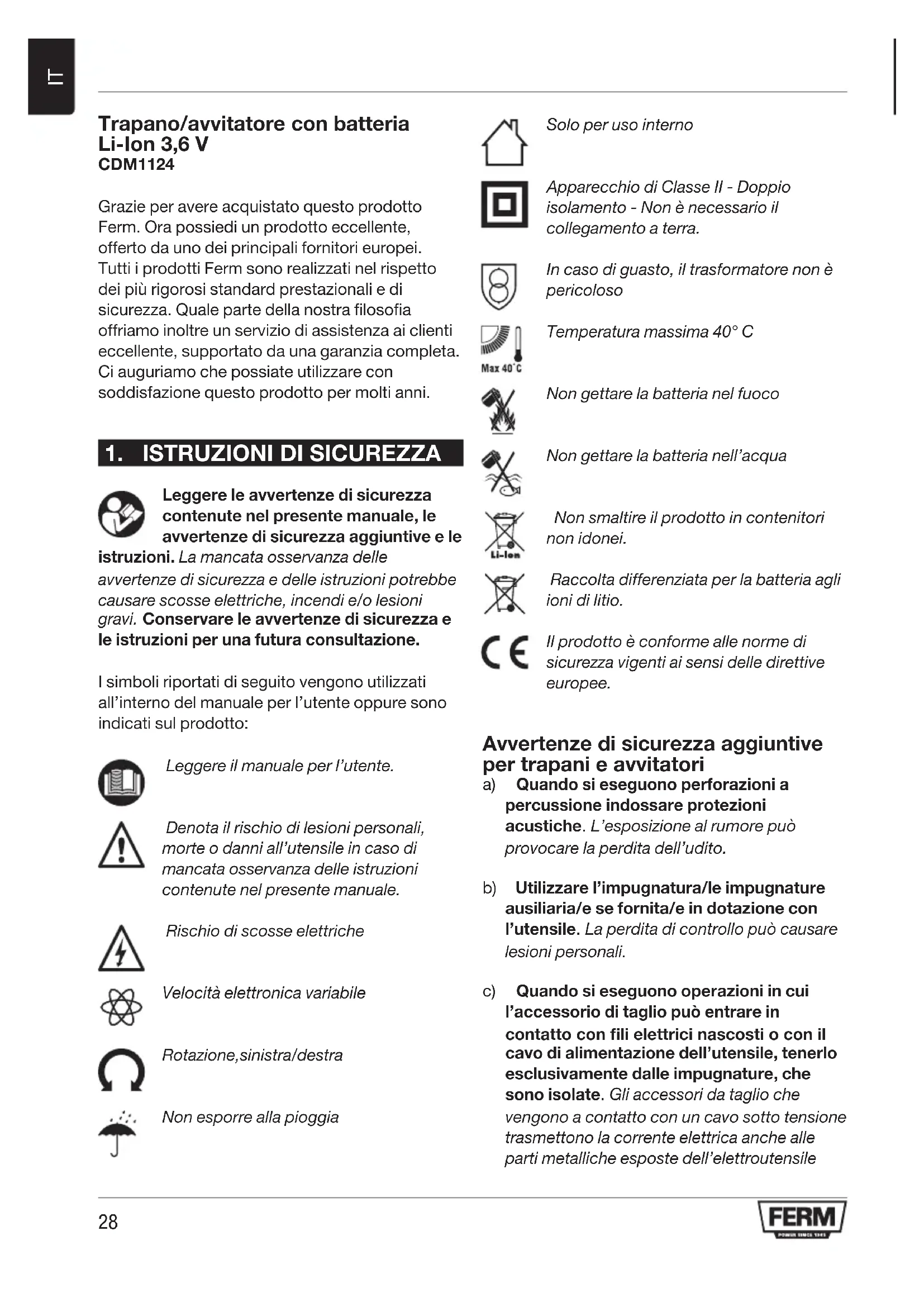 Trapano/avvitatore con batteria Li-Ion 3,6 V CDM1124 Grazie per avere acquistato questo prodotto Ferm. Ora possiedi un prodotto eccellente, offerto da uno dei principali fornitori europei. Tutti i prodotti Ferm sono realizzati nel rispetto dei più rigorosi standard prestazionali e di sicurezza. Quale parte della nostra filosofia offriamo inoltre un servizio di assistenza ai clienti eccellente, supportato da una garanzia completa. Ci auguriamo che possiate utilizzare con soddisfazione questo prodotto per molti anni.