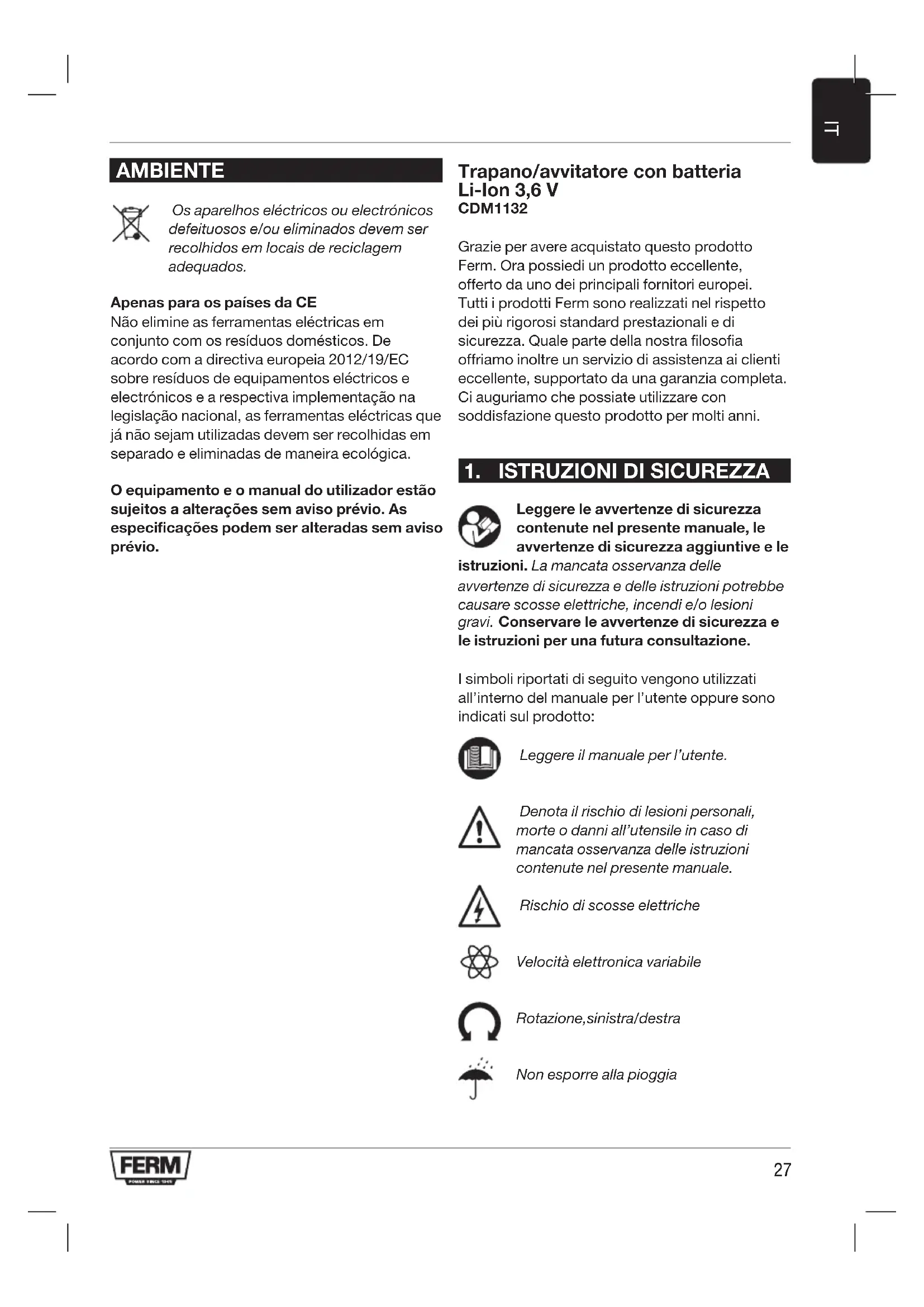 Solo per uso interno Apparecchio di Classe II - Doppio isolamento - Non è necessario il collegamento a terra. In caso di guasto, il trasformatore non è pericoloso Temperatura massima 40° C Non gettare la batteria nel fuoco Non gettare la batteria nell’acqua Non smaltire il prodotto in contenitori non idonei. Raccolta differenziata per la batteria agli ioni di litio. Il prodotto è conforme alle norme di sicurezza vigenti ai sensi delle direttive europee. Avvertenze di sicurezza aggiuntive per trapani e avvitatori a) Quando si eseguono perforazioni a percussione indossare protezioni acustiche. L’esposizione al rumore può provocare la perdita dell’udito. b) Utilizzare l’impugnatura/le impugnature ausiliaria/e se fornita/e in dotazione con l’utensile. La perdita di controllo può causare lesioni personali. c) Quando si eseguono operazioni in cui il dispositivo di ssaggio potrebbe entrare in contatto con li elettrici nascosti, tenerlo esclusivamente dalle superci di presa isolate. Gli avvitatori che vengono a contatto con un cavo sotto tensione trasmettono la corrente elettrica anche alle parti metalliche esposte dell'elettroutensile con il pericolo di provocare la folgorazione dell'operatore. Uso e manutenzione dell’utensile a batteria a) Ricaricare l’utensile esclusivamente con il caricabatterie specicato dal costruttore. Un caricabatterie adatto a un determinato tipo di batteria può comportare il rischio di incendio se utilizzato con una batteria diversa. b) Gli elettroutensili devono essere usati esclusivamente con i tipi di batterie specicatamente indicati. L’uso di batterie di tipi diversi può comportare il rischio di lesioni e di incendio. c) Quando la batteria non viene utilizzata, tenerla lontano da oggetti metallici, come fermagli, monete, chiavi, chiodi, viti o altri piccoli oggetti di metallo, che potrebbero provocare un contatto dei morsetti. Il corto circuito dei morsetti della batteria può dare origine a ustioni o incendi. d) In condizioni di impiego non corretto, si potrebbe vericare la fuoriuscita del liquido dalla batteria; evitarne il contatto. In caso di contatto, sciacquare con abbondante acqua. Se il liquido viene a contatto con gli occhi, consultare anche un medico. Il liquido fuoriuscito dalla batteria può causare irritazione o ustioni. e) Le batterie integrate possono essere rimosse esclusivamente da personale qualicato. Assistenza a) L’assistenza per l’elettroutensile deve essere prestata da un tecnico qualicato che utilizzi soltanto ricambi originali. In questo modo viene garantita la sicurezza dell’elettroutensile. Caricabatterie Uso previsto Utilizzare esclusivamente batterie ricaricabili agli ioni di litio da 3,6V e max. 1,3 Ah. Batterie di tipi diversi potrebbero esplodere provocando lesioni personali e danni. a) L’apparecchio non deve essere usato da persone con capacità siche, sensoriali o mentali ridotte (bambini inclusi) o che non29