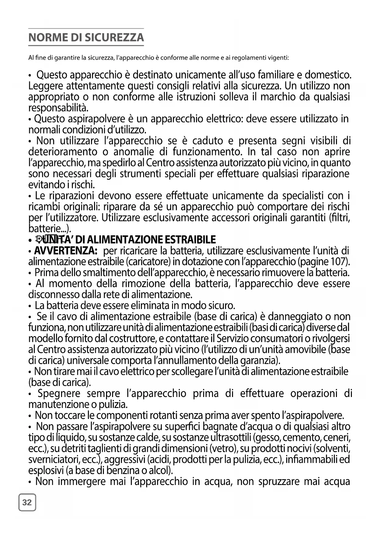 - Scollegare il cavo dalla presa di corrente prima di sottoporre l’apparecchio a pulizia o manutenzione. NORME DI SICUREZZA RELATIVE ALLA BATTERIA* (*a seconda del modello)