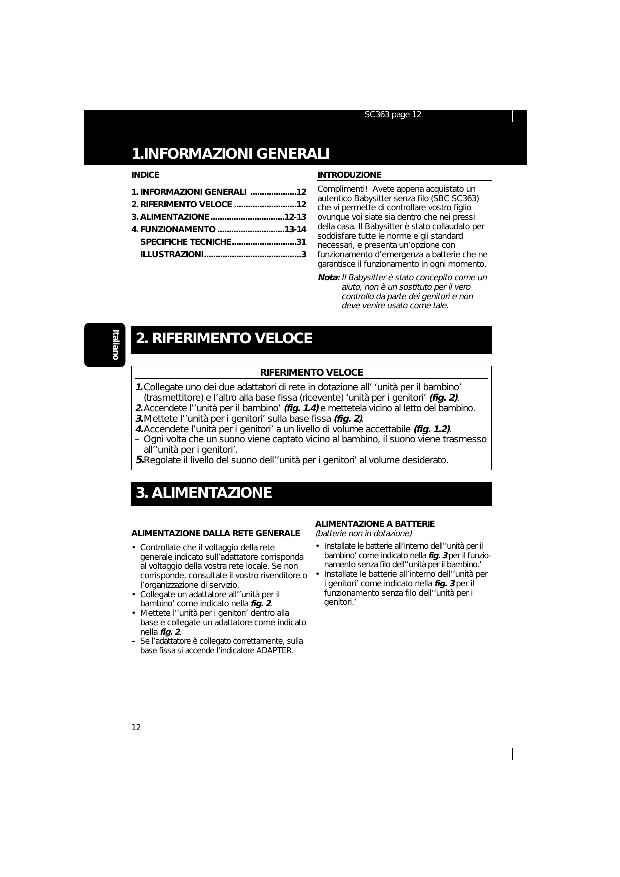 SPECIFICHE TECNICHE............................31 ILLUSTRAZIONI..........................................3 Complimenti! Avete appena acquistato un autentico Babysitter senza filo (SBC SC363) che vi permette di controllare vostro figlio ovunque voi siate sia dentro che nei pressi della casa. Il Babysitter è stato collaudato per soddisfare tutte le norme e gli standard necessari, e presenta un’opzione con funzionamento d’emergenza a batterie che ne garantisce il funzionamento in ogni momento. Nota: Il Babysitter è stato concepito come un aiuto, non è un sostituto per il vero controllo da parte dei genitori e non deve venire usato come tale. Italiano