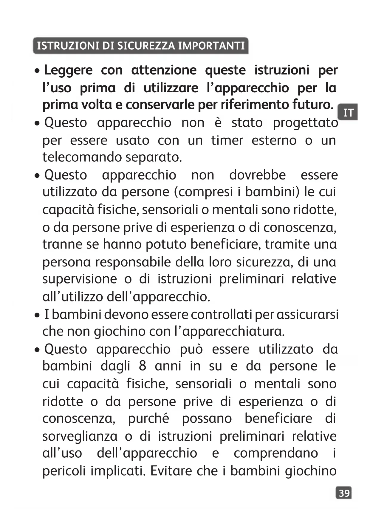 - Questo apparecchio non dovrebbe essere utilizzato da persone (compresi i bambini) le cui capacità fisiche, sensoriali o mentali sono ridotte, o da persone prive di esperienza o di conoscenza, tranne se hanno potuto beneficiare, tramite una persona responsabile della loro sicurezza, di una supervisione o di istruzioni preliminari relative all’utilizzo dell’apparecchio.