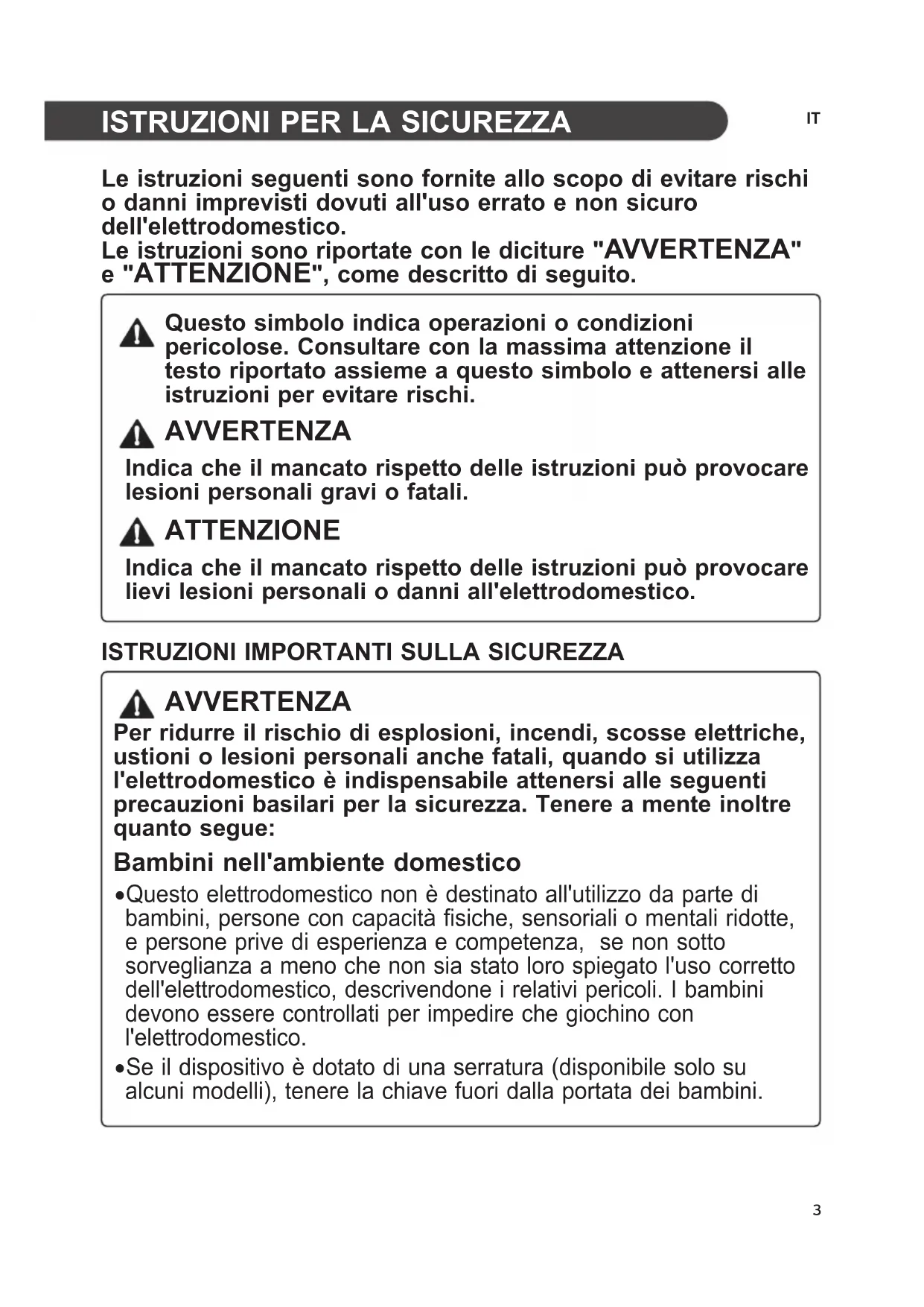 AVVERTENZA Per ridurre il rischio di esplosioni, incendi, scosse elettriche, ustioni o lesioni personali anche fatali, quando si utilizza l'elettrodomestico è indispensabile attenersi alle seguenti precauzioni basilari per la sicurezza. Tenere a mente inoltre quanto segue: Bambini nell'ambiente domestico