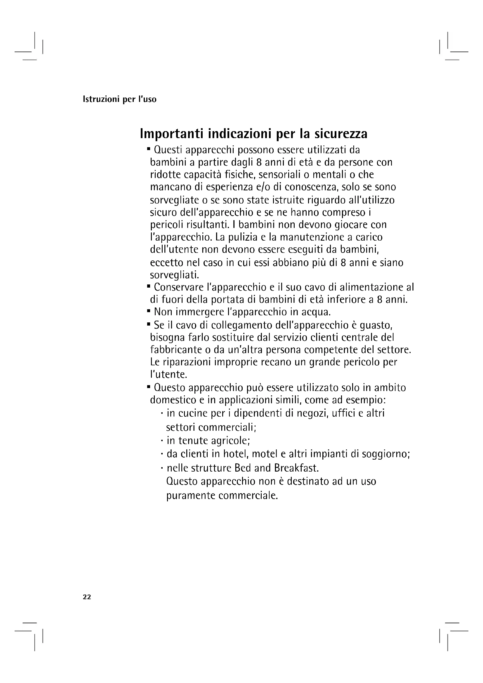 - Questi apparecchi possono essere utilizzati da bambini a partire dagli 8 anni di età e da persone con ridotte capacità fisiche, sensoriali o mentali o che mancano di esperienza e/o di conoscenza, solo se sono sorvegliate o se sono state istruite riguardo all’utilizzo sicuro dell’apparecchio e se ne hanno compreso i pericoli risultanti. I bambini non devono giocare con l’apparecchio. La pulizia e la manutenzione a carico dell’utente non devono essere eseguiti da bambini, eccetto nel caso in cui essi abbiano più di 8 anni e siano sorvegliati.