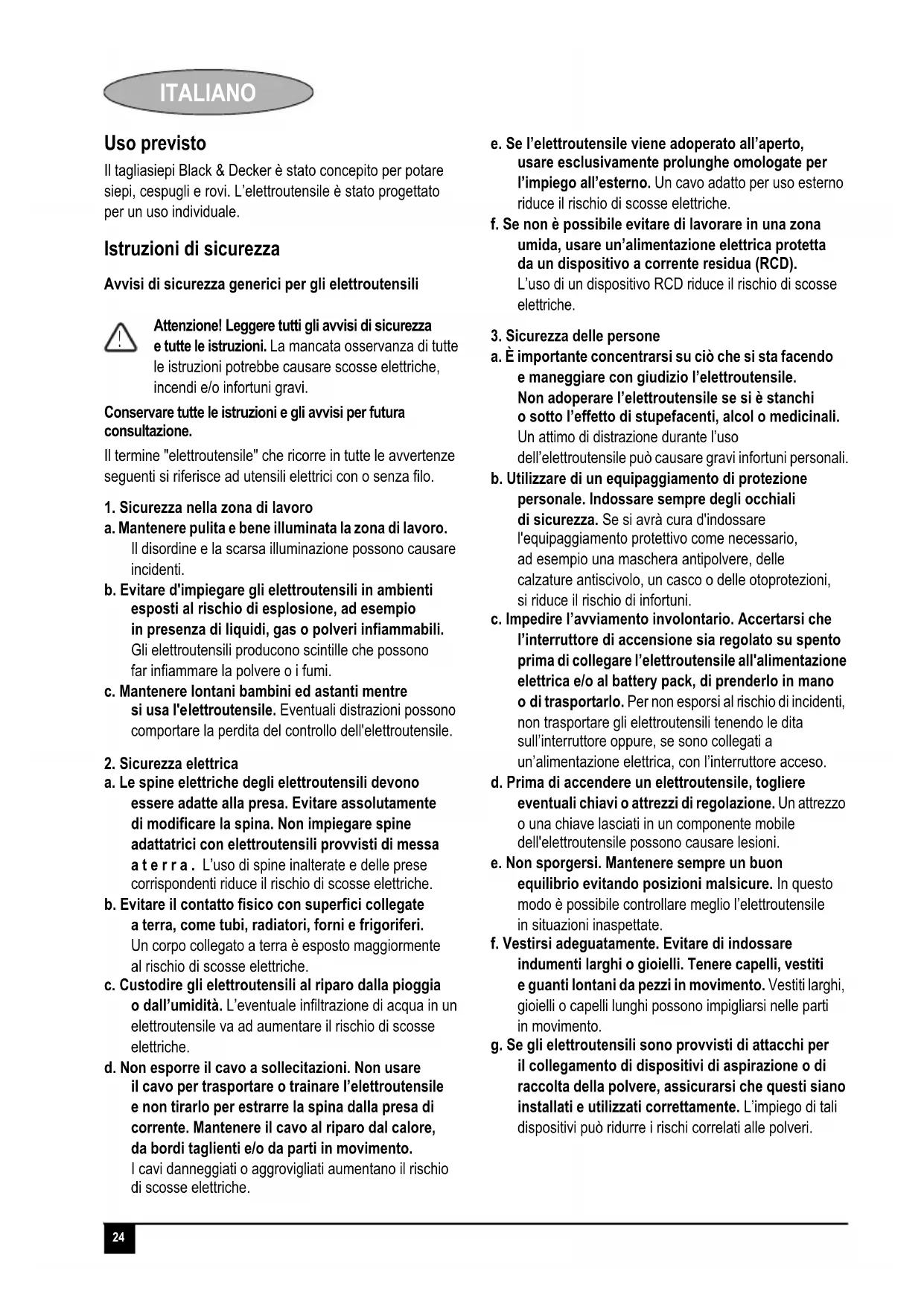 a. Fare riparare l’elettroutensile solo ed esclusivamente da personale specializzato e solo impiegando pezzi di ricambio originali, onde non alterarne la sicurezza. Altri avvisi di sicurezza per gli elettroutensili Tenere ogni parte del corpo lantana dalla lama. Non rimuovere il materiale tagliato e non tenere con le mani il materiale da potare quando le lame sono in movimento. Accertarsi che l’interruttore sia spento quando si elimina del materiale che si è inceppato. Un attimo di distrazione durante l’uso del tagliasiepi può causare gravi infortuni personali. Trasportare il tagliasiepi dall’impugnatura con la lama ferma. Quando si trasporta o si ripone il tagliasiepi montare sempre il fodero della lama. Un utilizzo corretto del tagliasiepi riduce il rischio di lesioni personali causate dalle lame. Tenere il cavo lontano dalla zona di potatura. Durante il funzionamento il cavo potrebbe essere nascosto nei cespugli ed è facile tagliarlo accidentalmente con la lama. Prestare attenzione ad evitare oggetti duri (ad esempio filo metallico, inferriate) durante la potatura. Se si dovesse accidentalmente colpire un oggetto di questo tipo, spegnere immediatamente l’elettroutensile e controllare se ha subito danni. Tenere sempre l’elettroutensile con entrambe le mani e mediante le impugnature fornite. Questo elettroutensile non è stato progettato per impiego da parte di persone (o bambini) portatrici di handicap fisici, psichici o sensoriali o che non abbiano la dovuta esperienza o conoscenza, a meno che non siano seguite o opportunamente istruite sul suo impiego da parte di una persona responsabile della loro sicurezza. Controllare che i bambini non giochino con l'elettroutensile. L'uso previsto è descritto nel presente manuale d’uso. L'uso di questo elettroutensile con accessori o altre parti montate oppure per scopi diversi da quelli raccomandati nel presente manuale, potrebbe essere causa di lesioni personali e/o danni materiali. Evitare l’avviamento involontario. Non trasportare l’elettroutensile con la mano o il dito sull’impugnatura anteriore o sull’interruttore a grilletto, a meno che non sia stato scollegato dalla presa di corrente o che non sia stata tolta la batteria. Accertarsi che l’elettroutensile sia spento quando lo si collega alla presa di corrente. Se non si è mai usato un tagliasiepi prima d’ora, è preferibile chiedere a un utente esperto una dimostrazione pratica oltre a studiare il presente manuale. Avvisi di sicurezza per il tagliasiepi. !26 ITALIANO Non toccare mai le lame quando l’elettroutensile è acceso. Non tentare mai di fermare a forza e lame. Non appoggiare l’elettroutensile fino a quando le lame non si sono completamente fermate. Controllare regolarmente che le lame non siano danneggiate e usurate. Non usare l’elettroutensile quando le lame sono danneggiate. Se l’elettroutensile dovesse cominciare a vibrare in modo anomalo, spegnerlo immediatamente e controllare se vi sono danni. Se l’elettroutensile si blocca, spegnerlo immediatamente. Scollegare l’elettroutensile dalla presa di corrente o togliere la batteria prima di tentare di rimuovere eventuali ostruzioni. Dopo l’uso, infilare la guaina fornita sopra alle lame. Riporre l’elettroutensile, verificando che la lama non sia esposta. Controllare sempre che tutte le protezioni siano montate quando si usa l’elettroutensile. Non tentare mai di usare un elettroutensile non completo o che abbia subito modifiche non autorizzate. Non permettere mai ai bambini di usare l’elettroutensile. Essere consapevoli della possibilità di caduta dei pezzi tagliati dai lati più alti di una siepe. Sicurezza altrui Questo elettroutensile non è stato progettato per impiego da parte di persone (o bambini) portatrici di handicap fisici, psichici o sensoriali o che non abbiano la dovuta esperienza o conoscenza, a meno che non siano seguite o opportunamente istruite sul suo utilizzo da parte di una persona responsabile della loro sicurezza. Controllare che i bambini non giochino con l’elettroutensile. Vibrazioni I valori dichiarati delle emissioni di vibrazioni al paragrafo Dati tecnici e Dichiarazione di conformità del presente manuale, sono stati misurati in base al metodo di test standard previsto dalla normativa EN 60745 e possono essere usati come paragone tra un attrezzo e un altro. Il valore delle emissioni di vibrazioni dichiarato può anche essere usato come valutazione preliminare dell’esposizione. Attenzione! Il valore delle emissioni di vibrazioni durante l’impiego effettivo dell’elettroutensile può variare da quello dichiarato a seconda di come l'attrezzo viene usato. Il livello delle vibrazioni può aumentare oltre il livello dichiarato. Quando si valuta l’esposizione alle vibrazioni per determinare le misure di sicurezza richieste, in conformità alla normativa 2002/44/CE, onde proteggere le persone che usano regolarmente gli elettroutensili ai fini delle mansioni svolte, è necessario prendere in considerazione le condizioni effettive di utilizzo e il modo in cui l’attrezzo è usato, oltre a tenere in conto tutte le componenti del ciclo operativo, vale a dire i periodi in cui l’elettroutensile è spento, quando è acceso, ma a riposo e quando è effettivamente utilizzato. Etichette sugli elettroutensili Sull’elettroutensile appaiono i seguenti pittogrammi: Sicurezza elettrica Il doppio isolamento di cui è provvisto l’elettroutensile rende superfluo il filo di terra. Controllare sempre che l’alimentazione corrisponda alla tensione indicata sulla targhetta delle caratteristiche. In caso di danneggiamento del cavo di alimentazione, è necessario farlo riparare dal fabbricante o presso un centro assistenza Black & Decker autorizzato in modo da evitare eventuali pericoli. La sicurezza elettrica può essere ulteriormente aumentata utilizzando un dispositivo a corrente residua (RCD) ad alta sensibilità (30 mA). Utilizzo di un cavo di prolunga Usare sempre