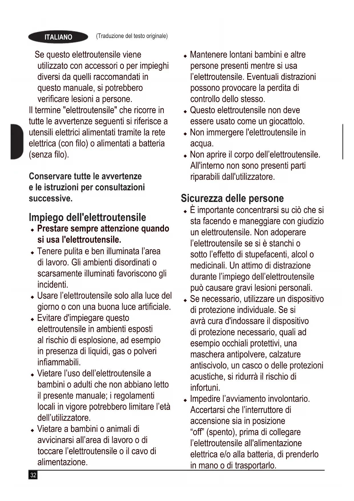 Déclaration de conformité CE DIRECTIVES MACHINESDIRECTIVE RELATIVE AUX NUISANCES SONORES EXTÉRIEURES BEBLV290, BEBLV300 - Aspirateur/SoufeurBlack & Decker déclare que les produits décrits dans les "Caractéristiques techniques" sont conformes aux normes :2006/42/CE, EN60335-1:2012+A11:2014; EN50636-2-100:20142000/14/CE, Aspirateur-soufeur, Annexe VDEKRA Quality B.V., Utrechtseweg 310, 6802 ED Arnhem,Numéro d'identication de l'organisme mandaté aux Pays-Bas : 0344Niveau de puissance sonore selon la norme 2000/14/CE(Article 13, Annexe III) :Niveau de puissance sonore : LwA : 102,5 dB(A); K=1,1 dB(A) Le niveau de puissance acoustique garanti : LWA : 104 dB(A)Ces produits sont également conformes aux Directives 2014/30/UE et 2011/65/UE. Pour plus de détails, veuillez contacter Black & Decker à l'adresse suivante ou consultez la dernière page du manuel.Le soussigné est responsable de la compilation du chier technique et fait cette déclaration au nom de Black & Decker.R. LaverickDirecteur IngénierieBlack & Decker Europe, 210 Bath Road, Slough,Berkshire, SL1 3YDRoyaume-Uni16/10/2018 Garantie Black & Decker est sûr de la qualité de ses produits et offre une garantie de 24 mois aux utilisateurs, à partir de la date d'achat. Cette garantie s'ajoute à vos droits légaux auxquels elle ne porte aucunement préjudice. Cette garantie est valable au sein des territoires des États membres de l’Union Européenne et au sein de la Zone européenne de libre-échange.Pour prétendre à la garantie, la réclamation doit être en conformité avec les conditions générales de Black & Decker et vous devez fournir une preuve d'achat au vendeur ou au réparateur agréé. Les conditions générales de la garantie de 2 ans Black&Decker ainsi que l'adresse du réparateur agrée le plus proche sont disponibles sur le site Internet www.2helpU.com ou en contactant votre agence Black & Decker locale à l'adresse indiquée dans ce manuel. Veuillez consulter notre site Internet www.blackanddecker.co.uk pour enregistrer votre nouveau produit Black & Decker et pour être tenu informé des nouveaux produits et offres spéciales. Uso previsto I modelli di sofatore aspiratore BEBLV290 e BEBLV300 BLACK+DECKER sono stati progettati per la rimozione di fogliame. Questi elettroutensili sono concepiti esclusivamente per uso domestico all’esterno. Avvertenze di sicurezza generiche per gli elettroutensili Avvertenza! Quando si usano utensili alimentati elettricamente, con o senza lo, osservare sempre le normali precauzioni di sicurezza per ridurre il rischio di incendio, scossa elettrica, lesioni alle persone e danni materiali. u Leggere attentamente il presente manuale prima di utilizzare l'elettroutensile; imparare bene i comandi e come usare in modo appropriato l'elettroutensile. u L'uso previsto è descritto in questo manuale.32 (Traduzione del testo originale) ITALIANO Se questo elettroutensile viene utilizzato con accessori o per impieghi diversi da quelli raccomandati in questo manuale, si potrebbero vericare lesioni a persone. Il termine "elettroutensile" che ricorre in tutte le avvertenze seguenti si riferisce a utensili elettrici alimentati tramite la rete elettrica (con lo) o alimentati a batteria (senza lo). Conservare tutte le avvertenze e le istruzioni per consultazioni successive. Impiego dell'elettroutensile u Prestare sempre attenzione quando si usa l'elettroutensile. u Tenere pulita e ben illuminata l’area di lavoro. Gli ambienti disordinati o scarsamente illuminati favoriscono gli incidenti. u Usare l’elettroutensile solo alla luce del giorno o con una buona luce articiale. u Evitare d'impiegare questo elettroutensile in ambienti esposti al rischio di esplosione, ad esempio in presenza di liquidi, gas o polveri inammabili. u Vietare l’uso dell’elettroutensile a bambini o adulti che non abbiano letto il presente manuale; i regolamenti locali in vigore potrebbero limitare l’età dell’utilizzatore. u Vietare a bambini o animali di avvicinarsi all’area di lavoro o di toccare l’elettroutensile o il cavo di alimentazione. u Mantenere lontani bambini e altre persone presenti mentre si usa l’elettroutensile. Eventuali distrazioni possono provocare la perdita di controllo dello stesso. u Questo elettroutensile non deve essere usato come un giocattolo. u Non immergere l'elettroutensile in acqua. u Non aprire il corpo dell’elettroutensile. All'interno non sono presenti parti riparabili dall'utilizzatore. Sicurezza delle persone u È importante concentrarsi su ciò che si sta facendo e maneggiare con giudizio un elettroutensile. Non adoperare l’elettroutensile se si è stanchi o sotto l’effetto di stupefacenti, alcol o medicinali. Un attimo di distrazione durante l’impiego dell’elettroutensile può causare gravi lesioni personali. u Se necessario, utilizzare un dispositivo di protezione individuale. Se si avrà cura d'indossare il dispositivo di protezione necessario, quali ad esempio occhiali protettivi, una maschera antipolvere, calzature antiscivolo, un casco o delle protezioni acustiche, si ridurrà il rischio di infortuni. u Impedire l’avviamento involontario. Accertarsi che l’interruttore di accensione sia in posizione “off” (spento), prima di collegare l’elettroutensile all'alimentazione elettrica e/o alla batteria, di prenderlo in mano o di trasportarlo.33 (Traduzione del testo originale) ITALIANO Per non esporsi al rischio di incidenti, non trasportare l'elettroutensile tenendo le dita sull’interruttore oppure se è collegato a una fonte di alimentazione elettrica, con l’interruttore acceso. u Non sporgersi troppo. Mantenere sempre un appoggio e un equilibrio adeguati. In questo modo è possibile controllare meglio l'elettroutensile in situazioni inattese. u Vestirsi adeguatamente. Non indossare abiti larghi o gioielli. Tenere i capelli, gli indumenti e i guanti lontano dalle parti mobili. Indumenti larghi, gioielli o capelli lunghi possono impigliarsi ne