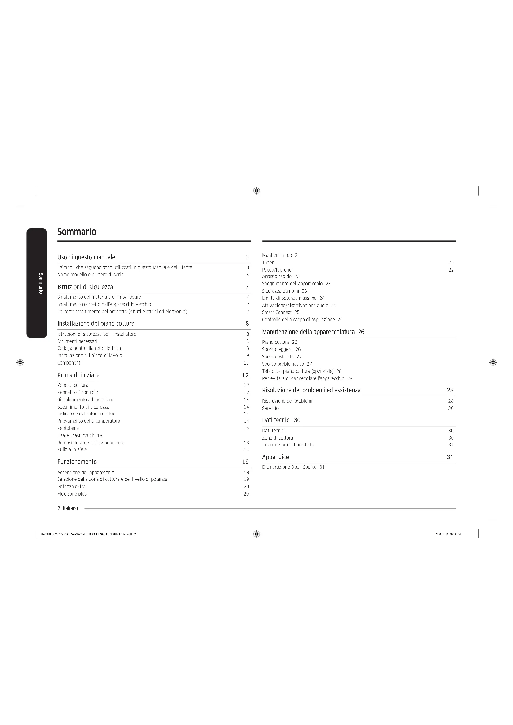 www.samsung.com/be/support (Dutch) www.samsung.com/be_fr/support (French) DENMARK 707 019 70 www.samsung.com/dk/support FINLAND 030-6227 515 www.samsung.com//support FRANCE 01 48 63 00 00 www.samsung.com/fr/support GERMANY 06196 77 555 77 www.samsung.com/de/support ITALIA 800-SAMSUNG (800.7267864) www.samsung.com/it/support CYPRUS 8009 4000 only from landline, toll free www.samsung.com/gr/support GREECE 80111-SAMSUNG (80111 726 7864) only from land line (+30) 210 6897691 from mobile and land line LUXEMBURG 261 03 710 www.samsung.com/be_fr/support NETHERLANDS 088 90 90 100 www.samsung.com/nl/support NORWAY 815 56480 www.samsung.com/no/support PORTUGAL 808 207 267 www.samsung.com/pt/support SPAIN 0034902172678 www.samsung.com/es/support SWEDEN 0771 726 786 www.samsung.com/se/support SWITZERLAND 0800 726 78 64 (0800-SAMSUNG) www.samsung.com/ch/support (German) www.samsung.com/ch_fr/support (French) UK 0330 SAMSUNG (7267864) www.samsung.com/uk/support IRELAND (EIRE) 0818 717100 www.samsung.com/ie/support DG68-01068A-00 NZ6000K NZ64N7757GK_NZ64N7757FK_DG68-01068A-00_FR+DE+IT+NL.indb 32 2018-02-23 7:04:30Piano cottura a induzione Manuale dell'utente NZ64N7757GK / NZ64N7757FK NZ6000K NZ64N7757GK_NZ64N7757FK_DG68-01068A-00_FR+DE+IT+NL.indb 1 2018-02-23 7:04:312 Italiano Sommario Mantieni caldo 21 Timer 22 Pausa/Riprendi 22 Arresto rapido 23 Spegnimento dell'apparecchio 23 Sicurezza bambini 23 Limite di potenza massimo 24 Attivazione/disattivazione audio 25 Smart Connect 25 Controllo della cappa di aspirazione 26 Manutenzione della apparecchiatura 26 Piano cottura 26 Sporco leggero 26 Sporco ostinato 27 Sporco problematico 27 Telaio del piano cottura (opzionale) 28 Per evitare di danneggiare l'apparecchio 28 Risoluzione dei problemi ed assistenza 28 Risoluzione dei problemi 28 Servizio 30 Dati tecnici 30 Dati tecnici 30 Zone di cottura 30 Informazioni sul prodotto 31 Appendice 31 Dichiarazione Open Source 31 Sommario Uso di questo manuale 3 I simboli che seguono sono utilizzati in questo Manuale dell'utente. 3 Nome modello e numero di serie 3 Istruzioni di sicurezza 3 Smaltimento del materiale di imballaggio 7 Smaltimento corretto dell'apparecchio vecchio 7 Corretto smaltimento del prodotto (riuti elettrici ed elettronici) 7 Installazione del piano cottura 8 Istruzioni di sicurezza per l'installatore 8 Strumenti necessari 8 Collegamento alla rete elettrica 8 Installazione sul piano di lavoro 9 Componenti 11 Prima di iniziare 12 Zone di cottura 12 Pannello di controllo 12 Riscaldamento ad induzione 13 Spegnimento di sicurezza 14 Indicatore del calore residuo 14 Rilevamento della temperatura 14 Pentolame 15 Usare i tasti touch 18 Rumori durante il funzionamento 18 Pulizia iniziale 18 Funzionamento 19 Accensione dell'apparecchio 19 Selezione della zona di cottura e del livello di potenza 19 Potenza extra 20 Flex zone plus 20 NZ6000K NZ64N7757GK_NZ64N7757FK_DG68-01068A-00_FR+DE+IT+NL.indb 2 2018-02-23 7:04:31Italiano 3 Uso di questo manuale Uso di questo manuale Prima di utilizzare l'apparecchio, leggere attentamente il manuale dell'utente, prestando particolare attenzione alle informazioni sulla sicurezza contenute nella sezione che segue. Conservare questo manuale come riferimento futuro. Se l'apparecchio viene dato ad altre persone, ricordarsi di consegnare al nuovo utente anche questo manuale. I simboli che seguono sono utilizzati in questo Manuale dell'utente. AVVERTENZA Pericoli o pratiche non sicure che possono causare lesioni personali gravi o mortali. ATTENZIONE Pericoli o pratiche non sicure che possono causare lesioni personali lievi o danni materiali. ATTENZIONE Per evitare rischi di incendio, esplosione, scariche elettriche o lesioni personali durante l'uso del prodotto, seguire queste fondamentali precauzioni: NOTA Consigli, raccomandazioni e informazioni utili per un uso corretto del prodotto. Nome modello e numero di serie Sia il nome del modello sia il numero di serie sono riportati sotto la base del piano di cottura. Per usi futuri, annotare le informazioni o attaccare l'etichetta di prodotto aggiuntiva (situata sulla parte superiore del prodotto) su questa pagina. Nome modello Numero di serie Istruzioni di sicurezza Gli aspetti relativi alla sicurezza di questa apparecchiatura sono conformi a tutti gli standard tecnici e sulla sicurezza riconosciuti nel settore. Come costruttori, riteniamo sia nostra responsabilità mettervi a conoscenza delle seguenti istruzioni per la sicurezza. AVVERTENZA L’apparecchio non è inteso per l’uso da parte di persone (bambini inclusi) con ridotte capacità siche, sensoriali o mentali, inesperte o prive di una adeguata conoscenza, a meno che una persona responsabile per la loro sicurezza fornisca loro una corretta supervisione e istruzione all’uso. Sorvegliare i bambini afnché non giochino con l’apparecchio. Questo apparecchio può essere utilizzato da bambini di età superiore agli 8 anni e da persone con ridotte capacità siche, sensoriali o mentali o senza esperienza o conoscenza del prodotto solo sotto la supervisione di una persona responsabile o nel caso in cui abbiano ricevuto informazioni speciche sull’uso sicuro dell’apparecchio e ne abbiano compreso i rischi ad esso associati. Non consentire ai bambini di giocare con l’apparecchio. La pulizia e la manutenzione dell’apparecchio non devono essere eseguite da bambini senza la supervisione di un adulto. Il sistema di sconnessione deve essere incorporato nel cablaggio secondo quanto previsto dalle normative vigenti. NZ6000K NZ64N7757GK_NZ64N7757FK_DG68-01068A-00_FR+DE+IT+NL.indb 3 2018-02-23 7:04:314 Italiano Istruzioni di sicurezza Istruzioni di sicurezza Dopo l’uso, spegnere l’elemento a induzione del piano cottura mediante l’apposito comando, e non fare afdamento sul rilevatore di pentole. I prodotti non sono progettati per essere utilizzati con un timer esterno o con un sistema di controllo a distanza indipendente. ATTENZIONE: Il programma di cottura deve essere monitor