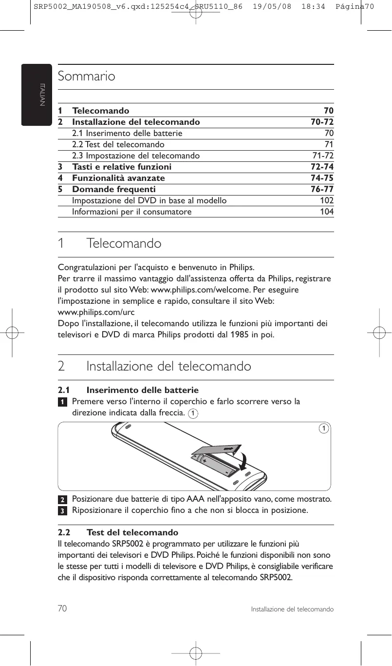 2.2 Test del telecomando Il telecomando SRP5002 è programmato per utilizzare le funzioni più importanti dei televisori e DVD Philips. Poiché le funzioni disponibili non sono le stesse per tutti i modelli di televisore e DVD Philips, è consigliabile verificare che il dispositivo risponda correttamente al telecomando SRP5002. 70