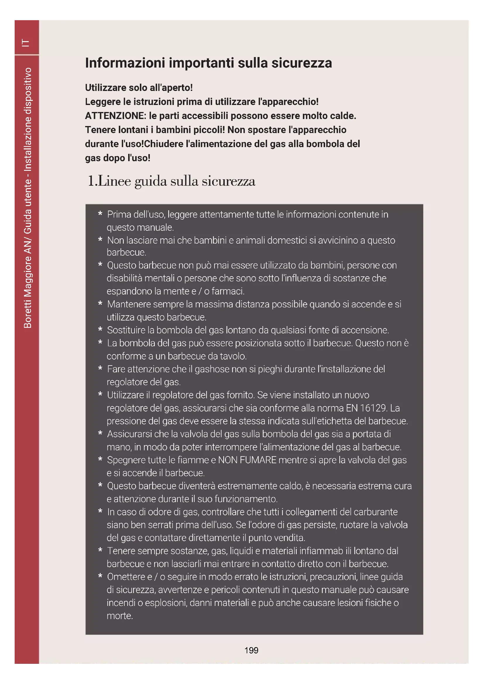 198Informazioni importanti sulla sicurezza Utilizzare solo all'aperto! Leggere le istruzioni prima di utilizzare l'apparecchio! ATTENZIONE: le parti accessibili possono essere molto calde. Tenere lontani i bambini piccoli! Non spostare l'apparecchio durante l'uso!Chiudere l'alimentazione del gas alla bombola del gas dopo l'uso! 1.Linee guida sulla sicurezza