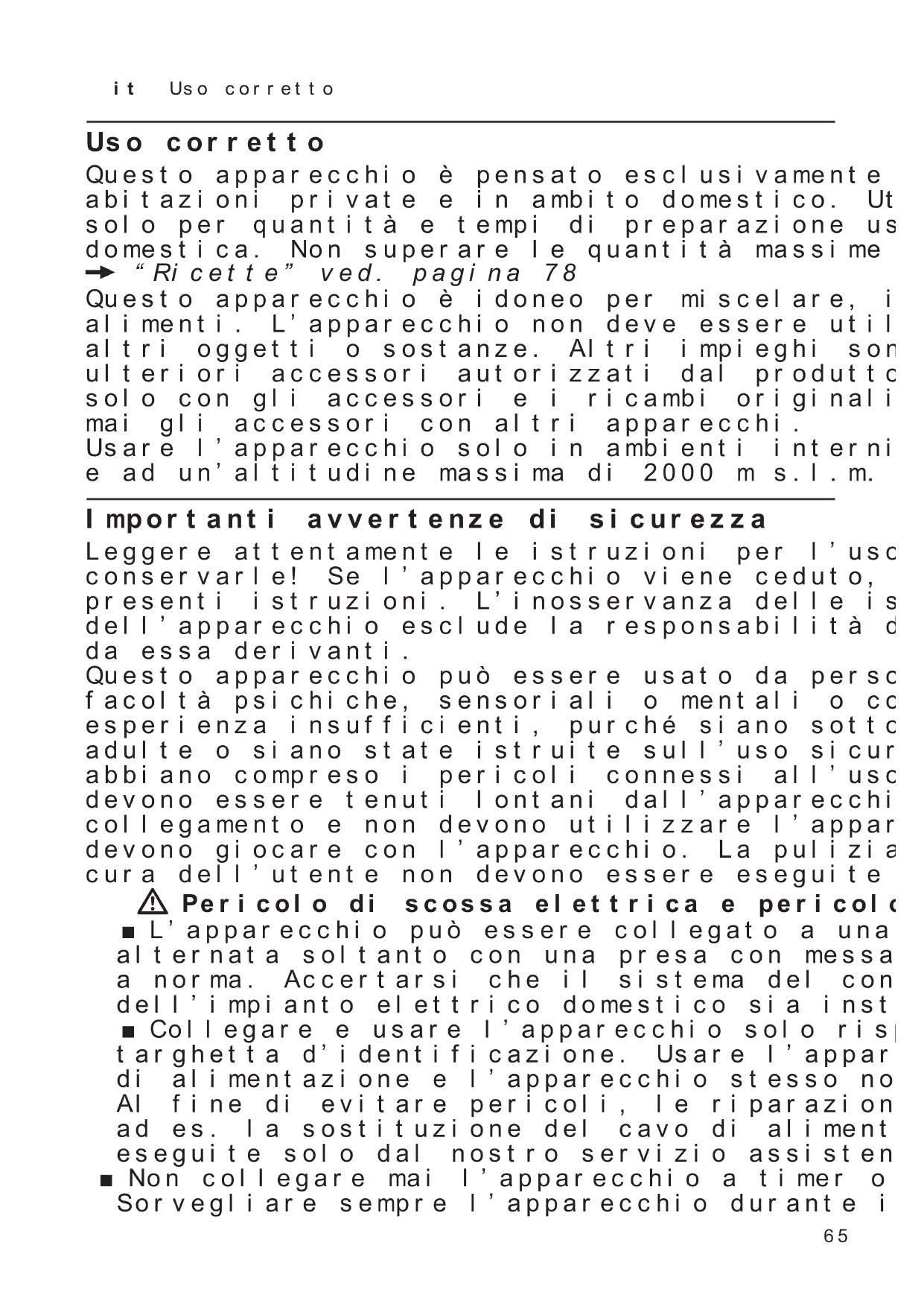 - SOUS-CHARGE lorsque SensorControl Plus est utilisé Trop d’ingrédients, ou pas assez, ont été ajoutés pour le programme sélectionné. ■ Ajouter les ingrédients en fonction des indications de quantité. X « Utilisation de SensorControl Plus » voir page 5365 it Uso corretto Uso corretto Questo apparecchio è pensato esclusivamente per l’utilizzo in abitazioni private e in ambito domestico. Utilizzare l’apparecchio solo per quantità e tempi di preparazione usuali nell’attività domestica. Non superare le quantità massime ammesse. X “Ricette” ved. pagina 78 Questo apparecchio è idoneo per miscelare, impastare e montare alimenti. L’apparecchio non deve essere utilizzato per lavorare altri oggetti o sostanze. Altri impieghi sono possibili se si utilizzano ulteriori accessori autorizzati dal produttore. Usare l’apparecchio solo con gli accessori e i ricambi originali approvati. Non utilizzare mai gli accessori con altri apparecchi. Usare l’apparecchio solo in ambienti interni a temperatura ambiente e ad un’altitudine massima di 2000 m s.l.m. Importanti avvertenze di sicurezza Leggere attentamente le istruzioni per l’uso, osservarle e conservarle! Se l’apparecchio viene ceduto, allegare anche le presenti istruzioni. L’inosservanza delle istruzioni per l’uso corretto dell’apparecchio esclude la responsabilità del costruttore per i danni da essa derivanti. Questo apparecchio può essere usato da persone con ridotte facoltà psichiche, sensoriali o mentali o con conoscenze e/o esperienza insufficienti, purché siano sotto il controllo di persone adulte o siano state istruite sull’uso sicuro dell’apparecchio e abbiano compreso i pericoli connessi all’uso dello stesso. I bambini devono essere tenuti lontani dall’apparecchio e dal cavo di collegamento e non devono utilizzare l’apparecchio. I bambini non devono giocare con l’apparecchio. La pulizia e la manutenzione a cura dell’utente non devono essere eseguite da bambini. W Pericolo di scossa elettrica e pericolo d’incendio! ■ L’apparecchio può essere collegato a una rete a corrente alternata soltanto con una presa con messa a terra installata a norma. Accertarsi che il sistema del conduttore di protezione dell’impianto elettrico domestico sia installato a norma. ■ Collegare e usare l’apparecchio solo rispettando i dati della targhetta d’identificazione. Usare l’apparecchio solo se il cavo di alimentazione e l’apparecchio stesso non presentano danni. Al fine di evitare pericoli, le riparazioni dell’apparecchio, come ad es. la sostituzione del cavo di alimentazione, devono essere eseguite solo dal nostro servizio assistenza clienti. ■ Non collegare mai l’apparecchio a timer o a prese telecomandate. Sorvegliare sempre l’apparecchio durante il funzionamento!66 it Importanti avvertenze di sicurezza ■ Non disporre l’apparecchio sopra oppure in prossimità di superfici molto calde, come per es. fornelli. Non mettere mai il cavo d’ali- mentazione a contatto con parti calde o tirarlo sopra spigoli vivi. ■ Non immergere mai l’apparecchio base in acqua né lavarlo in lavastoviglie. Non pulire con il vapore. Non usare l’apparecchio con le mani bagnate. ■ L’apparecchio va sempre scollegato dalla corrente elettrica dopo ogni utilizzo, se lasciato incustodito, prima del montaggio, dello smontaggio, della pulizia e in caso di guasti. W Pericolo di lesioni! ■ Prima di sostituire accessori o parti aggiuntive che durante il funzionamento si muovono, l’apparecchio deve essere spento e staccato dalla corrente. ■ Per abbassare il braccio oscillante non mettere le mani all’interno per evitare che dita o mani restino incastrate. Non spostare il braccio oscillante quando l’apparecchio è in funzione. ■ Mettere in funzione gli utensili soltanto con la ciotola inserita, il coperchio chiuso e i coperchi di sicurezza applicati! Per l’utilizzo degli accessori, montare la ciotola, il coperchio e i coperchi di sicurezza in base alle istruzioni! ■ Durante il funzionamento non introdurre mai le mani nella ciotola o nel pozzetto di riempimento. Non infilare oggetti (ad es. cucchiai da cucina) nella ciotola o nel pozzetto di riempimento. Tenere lontano mani, capelli, abiti e altri utensili dalle parti in rotazione. Dopo avere spento l’apparecchio, l’ingranaggio continua brevemente a girare. Attendere l’arresto completo dell’ingranaggio. ■ Non utilizzare mai contemporaneamente utensili e accessori o 2 accessori. Per l’uso degli accessori osservare sia il libretto d’istruzioni accluso sia le presenti istruzioni per l’uso. ■ Per l’uso degli accessori osservare le marcature colorate presenti sugli accessori e sull’ingranaggio. W Pericolo di soffocamento! Non lasciare che i bambini giochino con il materiale di imballaggio. W Attenzione! ■ Si consiglia di non lasciare mai l’apparecchio acceso più a lungo di quanto è necessario per la lavorazione dell’alimento. Non fare girare a vuoto l’apparecchio. ■ Il piano di lavoro deve essere ben accessibile, impermeabile, stabile, in piano, asciutto e sufficientemente grande, per evitare danni da spruzzi e poter lavorare liberamente. W Importante! Lavare sempre a fondo l’apparecchio dopo ogni utilizzo o dopo un lungo periodo di inattività. X “Pulizia e cura” ved. pagina 7767 it Panoramica Congratulazioni per l’acquisto di questo nuovo apparecchio di produzione Bosch. Trovate ulteriori informazioni sui nostri prodotti nel nostro sito Internet. www.bosch-home.com I nostri apparecchi sono soggetti a uno sviluppo continuo. Può pertanto succedere che alcune funzioni non corrispondano a quelle indicate in queste istruzioni. In questo caso verificare se sul nostro sito Internet è disponibile una versione più recente di queste istruzioni. Per utilizzare queste istruzioni per l’uso è possibile aprire i risvolti, dove si trovano figure dell’apparecchio contrassegnate con lettere e numeri ai qual