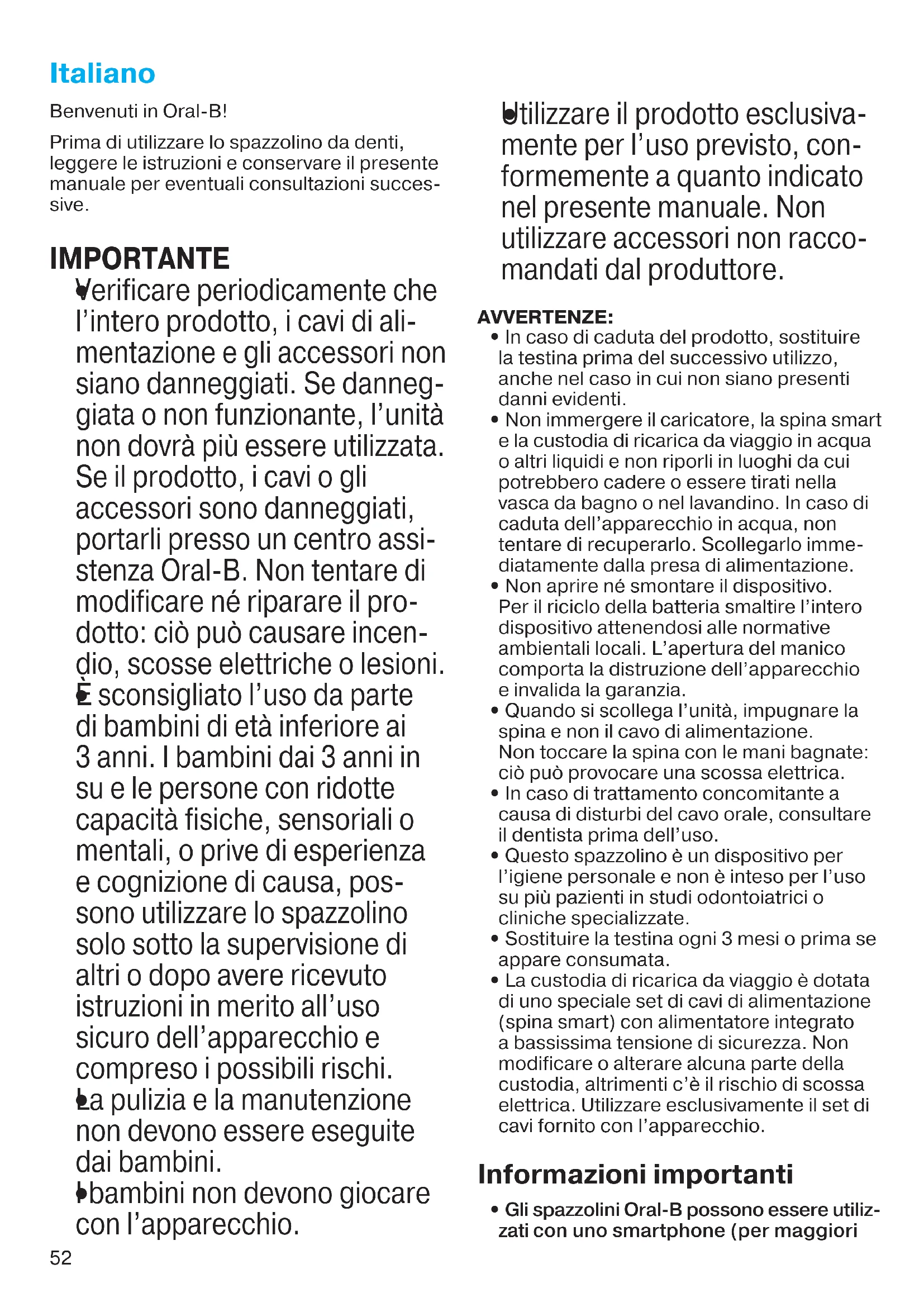 È sconsigliato l’uso da parte di bambini di età inferiore ai 3 anni. I bambini dai 3 anni in su e le persone con ridotte capacità fisiche, sensoriali o mentali, o prive di esperienza e cognizione di causa, pos- sono utilizzare lo spazzolino solo sotto la supervisione di altri o dopo avere ricevuto istruzioni in merito all’uso sicuro dell’apparecchio e compreso i possibili rischi.