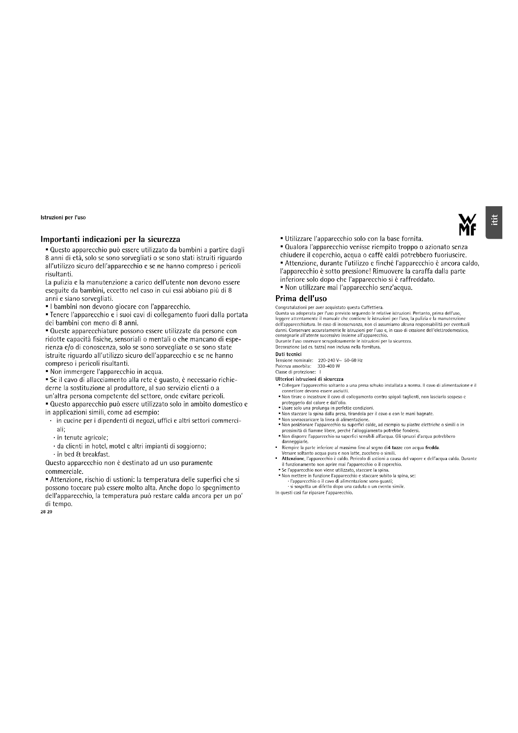 - Non ci si assume nessuna responsabilità per eventuali danni in caso di non osservanza delle indicazioni per la decalcifi cazione oppure di riparazione non effettuata da un professionista. In questi casi sono escluse anche le richieste di garanzia. Utilizzo La caffettiera WMF KÜCHENminis® è un apparecchio da cucina a risparmio energetico che occupa poco spazio. Con questo apparecchio è possibile preparare due o quattro tazze di caffè fresco e aromatico. La caffettiera è semplice e comoda da usare. Per risultati ottimali consigliamo l‘impiego di caffè espresso in polvere con macinatura medio-fi ne. Prima del primo utilizzo Posizionamento