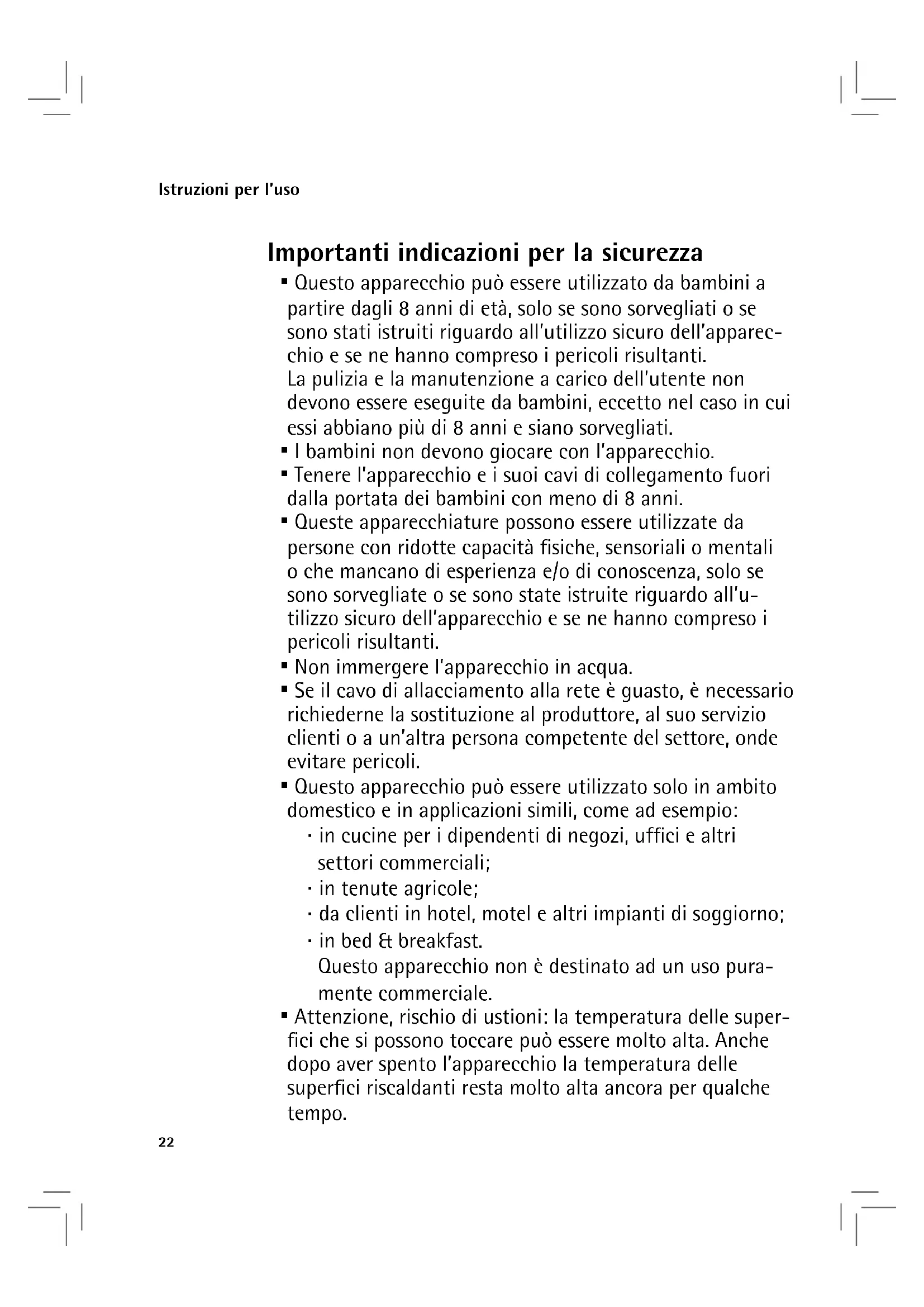 - Questo apparecchio può essere utilizzato da bambini a partire dagli 8 anni di età, solo se sono sorvegliati o se sono stati istruiti riguardo all’utilizzo sicuro dell’apparec- chio e se ne hanno compreso i pericoli risultanti. La pulizia e la manutenzione a carico dell’utente non devono essere eseguite da bambini, eccetto nel caso in cui essi abbiano più di 8 anni e siano sorvegliati.