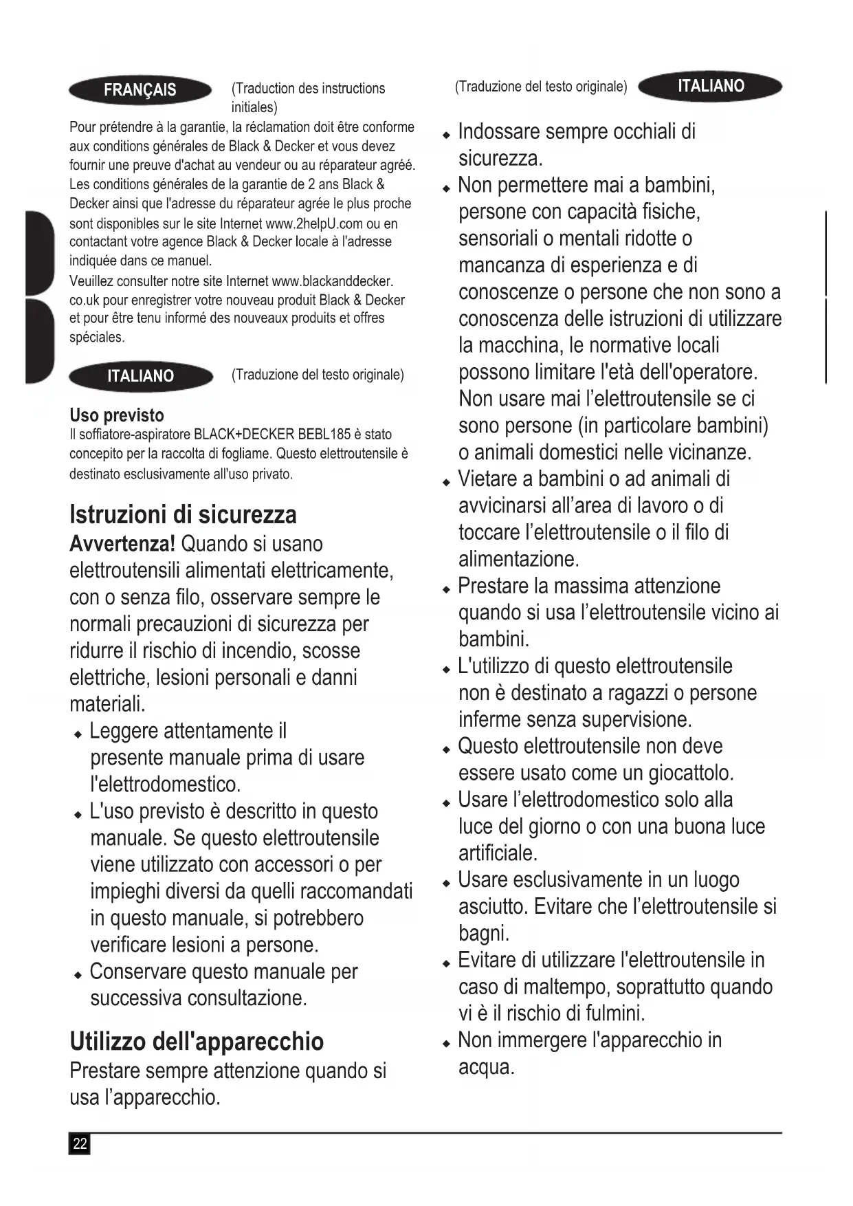 (puissance sonore garantie) 100 dB(A) Ces produits sont également conformes aux Directives 2014/30/UE et 2011/65/UE. Pour plus de détails, veuillez contacter Black & Decker à l'adresse suivante ou consultez la dernière page du manuel. Le soussigné est responsable de la compilation des données de la che technique et fait cette déclaration au nom de Black & Decker. R. Laverick Directeur Ingénierie Black & Decker Europe, 210 Bath Road, Slough, Berkshire, SL1 3YD Royaume-Uni 21/08/2018 Garantie Black & Decker est sûr de la qualité de ses produits et offre une garantie de 24 mois aux utilisateurs, à partir de la date d'achat. Cette garantie s'ajoute à vos droits légaux auxquels elle ne porte aucunement préjudice. Cette garantie est valable au sein des territoires des États membres de l’Union Européenne et au sein de la Zone européenne de libre- échange.22 (Traduction des instructions initiales) FRANÇAIS (Traduzione del testo originale) ITALIANO Pour prétendre à la garantie, la réclamation doit être conforme aux conditions générales de Black & Decker et vous devez fournir une preuve d'achat au vendeur ou au réparateur agréé. Les conditions générales de la garantie de 2 ans Black & Decker ainsi que l'adresse du réparateur agrée le plus proche sont disponibles sur le site Internet www.2helpU.com ou en contactant votre agence Black & Decker locale à l'adresse indiquée dans ce manuel. Veuillez consulter notre site Internet www.blackanddecker. co.uk pour enregistrer votre nouveau produit Black & Decker et pour être tenu informé des nouveaux produits et offres spéciales. (Traduzione del testo originale) ITALIANO Uso previsto Il sofatore-aspiratore BLACK+DECKER BEBL185 è stato concepito per la raccolta di fogliame. Questo elettroutensile è destinato esclusivamente all'uso privato. Istruzioni di sicurezza Avvertenza! Quando si usano elettroutensili alimentati elettricamente, con o senza lo, osservare sempre le normali precauzioni di sicurezza per ridurre il rischio di incendio, scosse elettriche, lesioni personali e danni materiali. u Leggere attentamente il presente manuale prima di usare l'elettrodomestico. u L'uso previsto è descritto in questo manuale. Se questo elettroutensile viene utilizzato con accessori o per impieghi diversi da quelli raccomandati in questo manuale, si potrebbero vericare lesioni a persone. u Conservare questo manuale per successiva consultazione. Utilizzo dell'apparecchio Prestare sempre attenzione quando si usa l’apparecchio. u Indossare sempre occhiali di sicurezza. u Non permettere mai a bambini, persone con capacità siche, sensoriali o mentali ridotte o mancanza di esperienza e di conoscenze o persone che non sono a conoscenza delle istruzioni di utilizzare la macchina, le normative locali possono limitare l'età dell'operatore. Non usare mai l’elettroutensile se ci sono persone (in particolare bambini) o animali domestici nelle vicinanze. u Vietare a bambini o ad animali di avvicinarsi all’area di lavoro o di toccare l’elettroutensile o il lo di alimentazione. u Prestare la massima attenzione quando si usa l’elettroutensile vicino ai bambini. u L'utilizzo di questo elettroutensile non è destinato a ragazzi o persone inferme senza supervisione. u Questo elettroutensile non deve essere usato come un giocattolo. u Usare l’elettrodomestico solo alla luce del giorno o con una buona luce articiale. u Usare esclusivamente in un luogo asciutto. Evitare che l’elettroutensile si bagni. u Evitare di utilizzare l'elettroutensile in caso di maltempo, soprattutto quando vi è il rischio di fulmini. u Non immergere l'apparecchio in acqua.23 (Traduzione del testo originale) ITALIANO u Non aprire il corpo dell'elettroutensile, dato che al suo interno non sono presenti componenti riparabili da parte dell'utilizzatore. u Evitare di impiegare questo apparecchio in ambienti esposti al rischio di esplosione, ad esempio in presenza di liquidi, gas o polveri inammabili. u Questo elettrodomestico deve essere utilizzato solo con l'alimentatore fornito. Rischi residui. L'utilizzo dell'apparecchio può comportare rischi residui non necessariamente riportati nelle presenti avvertenze di sicurezza. Tali rischi possono sorgere a seguito di un uso prolungato o improprio, ecc. Pur osservando le norme di sicurezza e utilizzando dispositivi di protezione adeguati, certi rischi non possono essere evitati. Sono inclusi: u lesioni causate o subite a seguito del contatto con parti rotanti/in movimento; u lesioni causate o subite durante la sostituzione di parti, lame o accessori. u lesioni causate dall’impiego prolungato di un apparecchio (quando si utilizza qualsiasi apparecchio per lunghi periodi, accertarsi di fare regolarmente delle pause); u menomazioni uditive; u rischi per la salute causati dall'aspirazione di polvere generata dall'utilizzo dell'apparecchio (ad esempio, quando si lavora con il legno, in modo particolare quello di quercia, faggio o l'MDF). Uso e cura dell'elettroutensile u Prima dell'uso, vericare che l'elettroutensile non sia danneggiato e non presenti parti difettose. Controllare che non siano presenti parti rotte, interruttori danneggiati o altre condizioni che potrebbero incidere sul suo funzionamento. u Non usare l'elettroutensile se l'interruttore di accensione/ spegnimento non funziona correttamente. Un elettroutensile che non può essere controllato mediante l'interruttore è pericoloso e deve essere riparato. u Scollegare la spina dalla presa di corrente e/o la batteria dall'elettroutensile prima di regolarlo o di riporlo oppure di sostituire gli accessori. Queste precauzioni riducono la possibilità che l'elettroutensile venga messo in funzione accidentalmente. u Se pertinente, mantenere aflati e puliti gli utensili da taglio. La manutenzione corretta degli utensili da taglio con bordi aflati riduce le probabilità di inceppamento e ne facilita il controllo. u Non usare l'elettroutensile se alcune parti sono dannegg