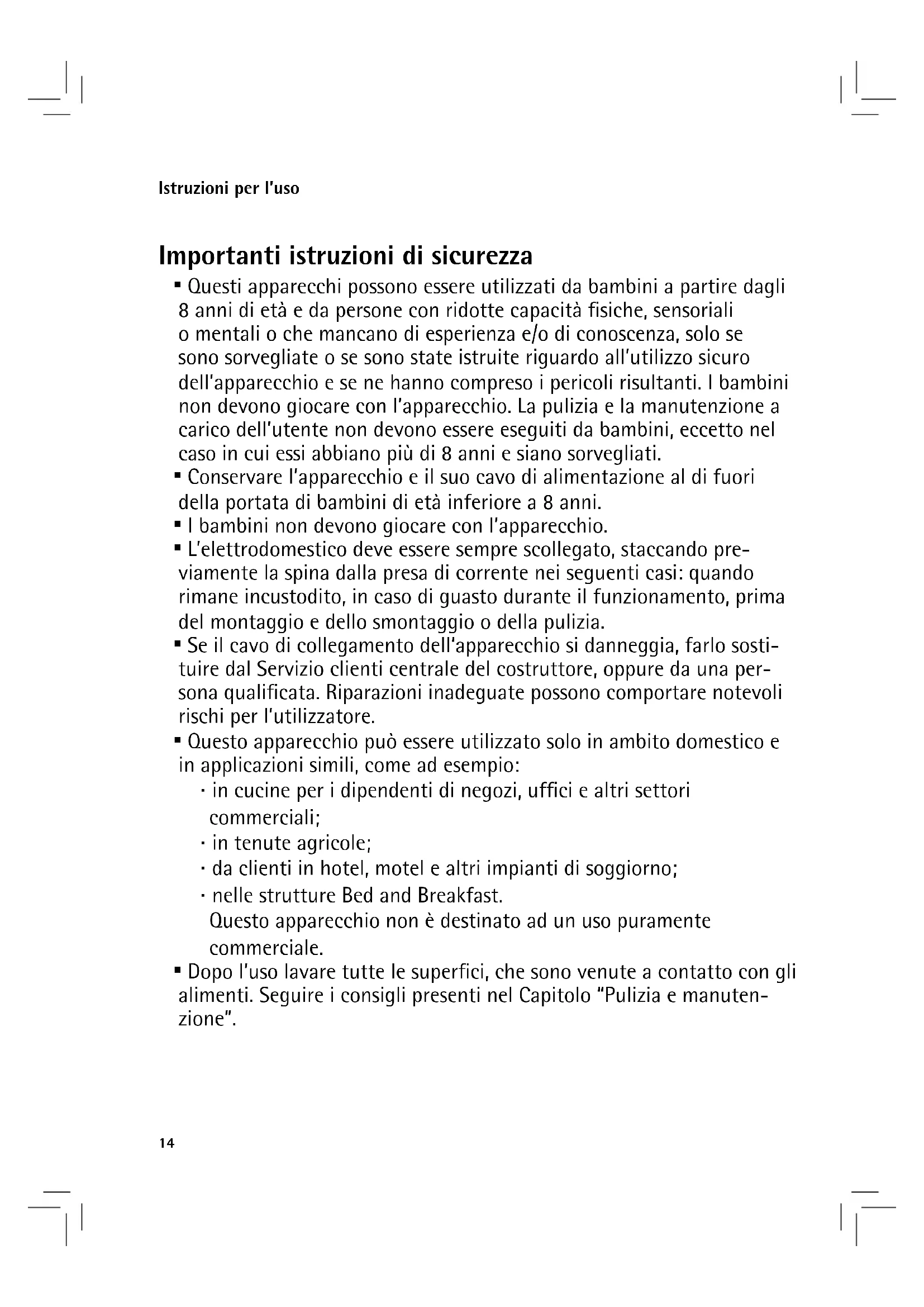 - Questi apparecchi sono essere utilizzati da bambini a partire dagli 8 anni di età e da persone con ridotte capacità fisiche, sensoriali o mentali o che mancano di esperienza e/o di conoscenza, solo se sono sorvegliate o se sono state istruite riguardo all'utilizzo sicuro dell'apparecchio e se ne hanno compreso i pericoli risultanti. I bambini non devono giocare con l'apparecchio. La pulizia e la manutenzione a carico dell'utente non devono essere eseguiti da bambini, eccetto nel caso in cuiassi abbiano più di 8 anni e siano sorvegliati.
