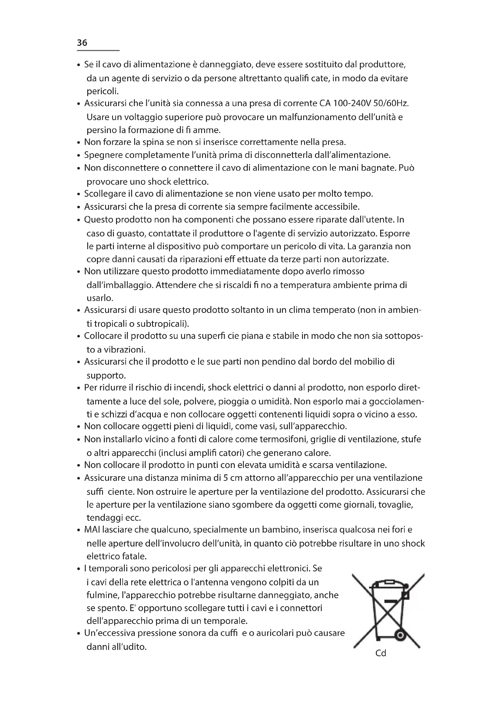 Vi preghiamo di leggere queste istruzioni di sicurezza e di rispettare le seguenti avvertenze prima di mettere in funzione l'apparecchio: Il simbolo del fulmine con una punta di freccia in un triangolo equilatero serve ad avvertire la presenza di un voltaggio pericoloso non isolato all’interno del prodotto di un livello suffi ciente a comportare il rischio di shock elettrico per una persona.Il punto esclamativo in un triangolo equilatero serve ad avvertire la presenza di importanti istruzioni operative e di manutenzione nella documentazione che accompagna l’apparecchio.Usare esclusivamente gli alimentatori elencati nel manuale utenteQuesto simbolo signi ca che il prodotto deve essere smaltito in modo rispettoso dell'ambiente, non insieme ai ri uti domestici.Tensione ACTensione DC Apparecchiatura di Classe II Per evitare incendi, tenete sempre lontane dall’apparecchio candele e qualunque altro tipo di amma. Avvertenza: