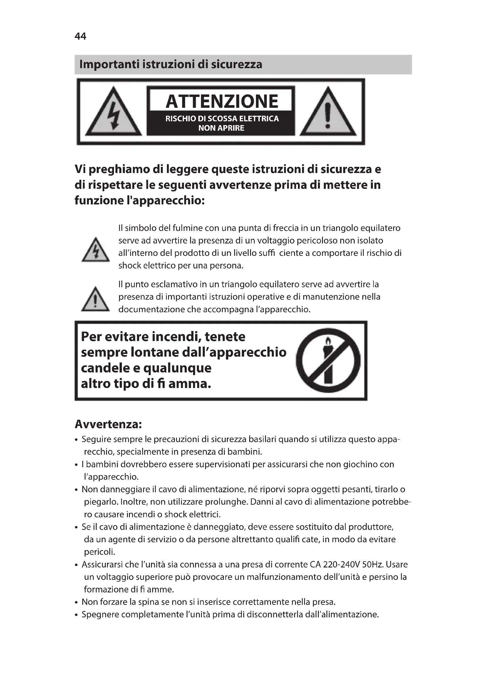 Vi preghiamo di leggere queste istruzioni di sicurezza e di rispettare le seguenti avvertenze prima di mettere in funzione l'apparecchio: Il simbolo del fulmine con una punta di freccia in un triangolo equilatero serve ad avvertire la presenza di un voltaggio pericoloso non isolato all’interno del prodotto di un livello suffi ciente a comportare il rischio di shock elettrico per una persona.Il punto esclamativo in un triangolo equilatero serve ad avvertire la presenza di importanti istruzioni operative e di manutenzione nella documentazione che accompagna l’apparecchio. Per evitare incendi, tenete sempre lontane dall’apparecchio candele e qualunque altro tipo di amma. Avvertenza: