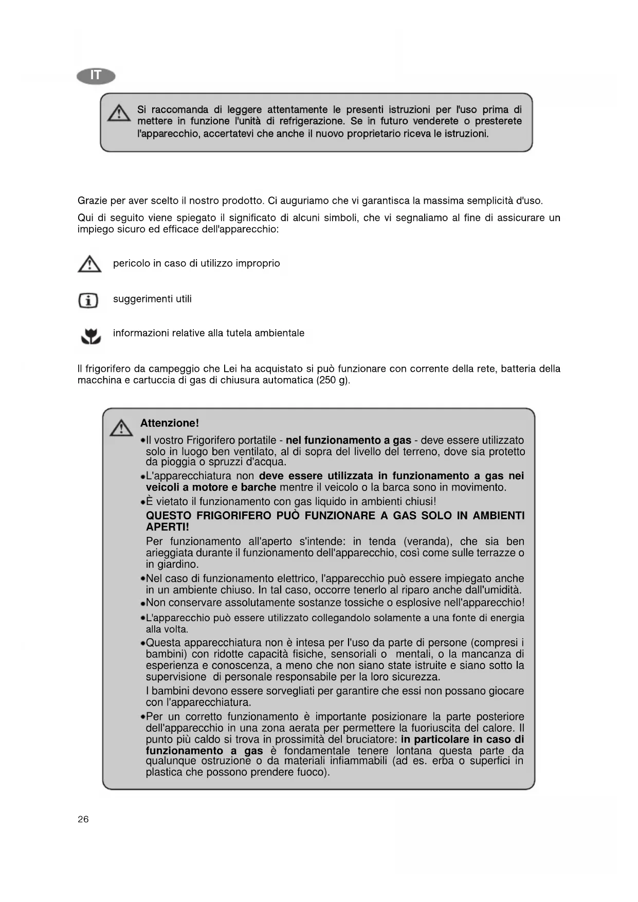 Grazie per aver scelto il nostro prodotto. Ci auguriamo che vi garantisca la massima semplicità d'uso. Qui di seguito viene spiegato il significato di alcuni simboli, che vi segnaliamo al fine di assicurare un impiego sicuro ed efficace dell'apparecchio: pericolo in caso di utilizzo improprio suggerimenti utili informazioni relative alla tutela ambientale ll frigorifero da campeggio che Lei ha acquistato si può funzionare con corrente della rete, batteria della macchina e cartuccia di gas di chiusura automatica (250 g). SSii rraaccccoommaannddaa ddii lleeggggeerree aatttteennttaammeennttee llee pprreesseennttii iissttrruuzziioonnii ppeerr ll''uussoo pprriimmaa ddii mmeetttteerree iinn ffuunnzziioonnee ll''uunniittàà ddii rreeffrriiggeerraazziioonnee.. SSee iinn ffuuttuurroo vveennddeerreettee oo pprreesstteerreettee ll''aappppaarreecccchhiioo,, aacccceerrttaatteevvii cchhee aanncchhee iill nnuuoovvoo pprroopprriieettaarriioo rriicceevvaa llee iissttrruuzziioonnii.. Attenzione! Il vostro Frigorifero portatile - nel funzionamento a gas - deve essere utilizzato solo in luogo ben ventilato, al di sopra del livello del terreno, dove sia protetto da pioggia o spruzzi d'acqua. L'apparecchiatura non deve essere utilizzata in funzionamento a gas nei veicoli a motore e barche mentre il veicolo o la barca sono in movimento. È vietato il funzionamento con gas liquido in ambienti chiusi! QUESTO FRIGORIFERO PUÒ FUNZIONARE A GAS SOLO IN AMBIENTI APERTI! Per funzionamento all'aperto s'intende: in tenda (veranda), che sia ben arieggiata durante il funzionamento dell'apparecchio, così come sulle terrazze o in giardino. Nel caso di funzionamento elettrico, l'apparecchio può essere impiegato anche in un ambiente chiuso. In tal caso, occorre tenerlo al riparo anche dall'umidità. Non conservare assolutamente sostanze tossiche o esplosive nell'apparecchio! L'apparecchio può essere utilizzato collegandolo solamente a una fonte di energia alla volta. Questa apparecchiatura non è intesa per l'uso da parte di persone (compresi i bambini) con ridotte capacità fisiche, sensoriali o mentali, o la mancanza di esperienza e conoscenza, a meno che non siano state istruite e siano sotto la supervisione di personale responsabile per la loro sicurezza. I bambini devono essere sorvegliati per garantire che essi non possano giocare con l'apparecchiatura. Per un corretto funzionamento è importante posizionare la parte posteriore dell'apparecchio in una zona aerata per permettere la fuoriuscita del calore. Il punto più caldo si trova in prossimità del bruciatore: in particolare in caso di funzionamento a gas è fondamentale tenere lontana questa parte da qualunque ostruzione o da materiali infiammabili (ad es. erba o superfici in plastica che possono prendere fuoco).27 SSOOMMMMAARRIIOO SSOOMMMMAARRIIOO