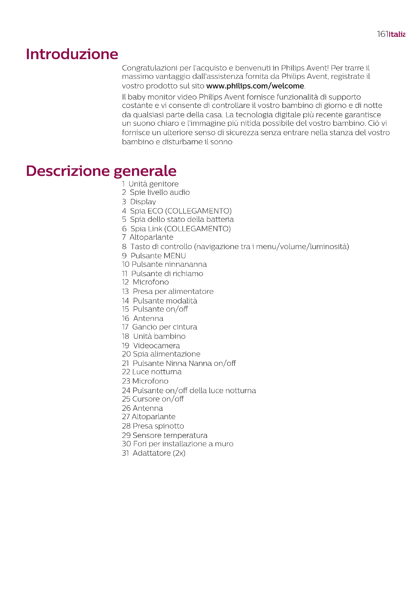 Congratulations per l'acquisto e benvenuti in Philips Avent! Per trattre il massimovantaggio dall'assistenza fornita da Philips Avent,registrare il.vostro prodotto sul site www.philips.com/welcome.
