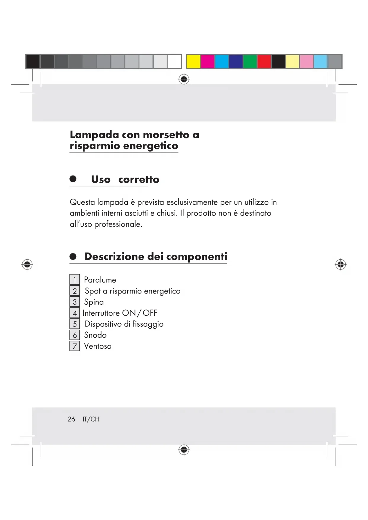 Ventosa27 IT/CH Dati tecnici Tensione di alimentazione: 230 V ∼, 50 Hz, max. 7 W Sistema di illuminazione: spot a risparmio energetico (lampadina), GU10, 230 V ∼, 50 Hz, max. 7 W Classe di protezione: Testato da TÜV / GS Modello-Nr.: Z31202 A nero, Z31202B bianco, Z31202C rosso Fornitura 1 Lampada da tavolo con clip 1 Spot a risparmio energetico 1 Ventosa 1 Libretto d’istruzioni d’uso28 IT/CH Sicurezza Indicazioni per la sicurezza In caso di danni causati dalla non osservanza di questo manuale d´uso, il diritto di garanzia decade! Per danni successivi non ci si assume alcuna responsabilità! Nel caso di danni a cose e persone causati dall’uso scorretto o dall’inosservanza delle avvertenze di sicurezza non ci si assume alcuna responsabilità!