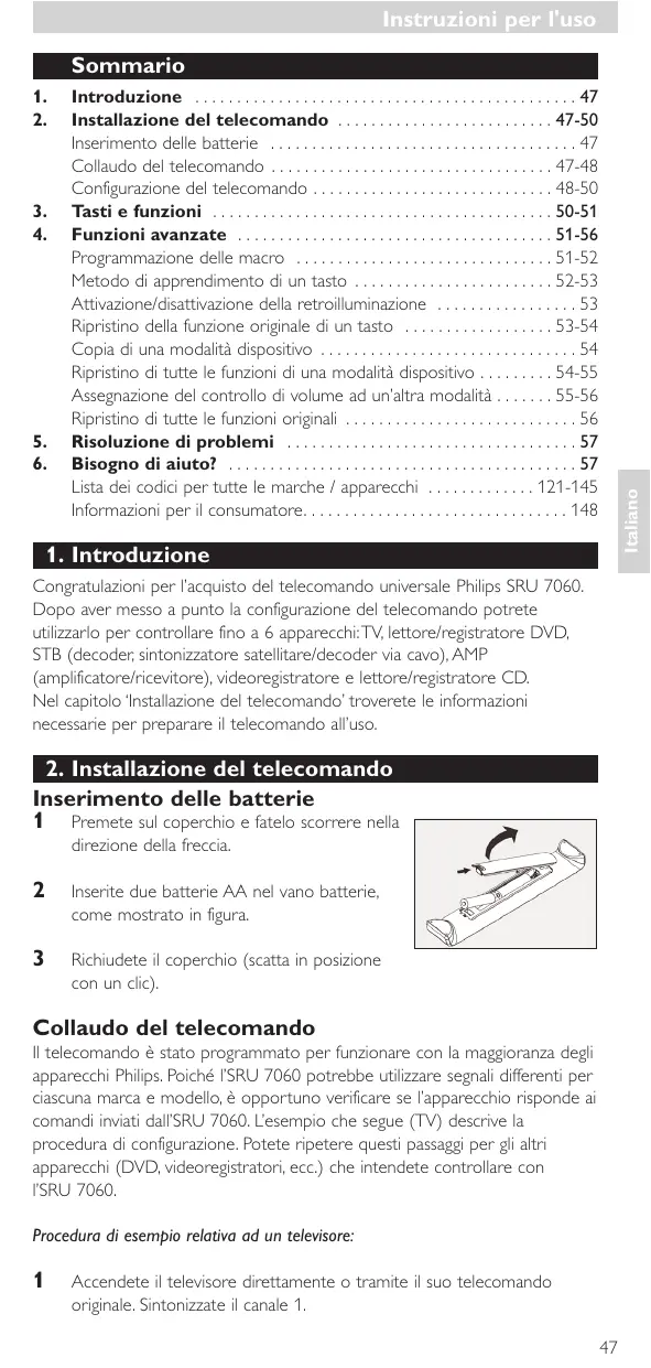 Congratulazioni per l’acquisto del telecomando universale Philips SRU 7060. Dopo aver messo a punto la configurazione del telecomando potrete utilizzarlo per controllare fino a 6 apparecchi:TV, lettore/registratore DVD, STB (decoder, sintonizzatore satellitare/decoder via cavo), AMP (amplificatore/ricevitore), videoregistratore e lettore/registratore CD. Nel capitolo ‘Installazione del telecomando’ troverete le informazioni necessarie per preparare il telecomando all’uso.