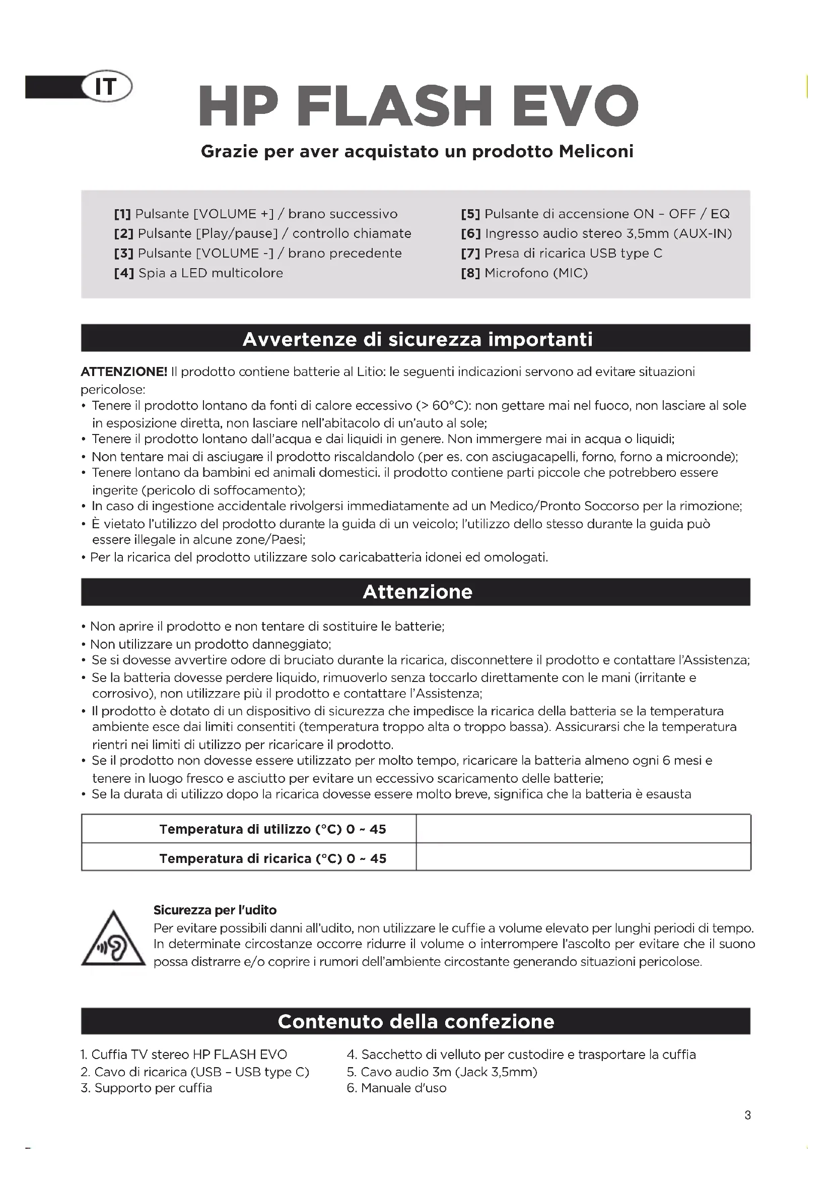 contemporaneamente Spia a LED La spia a LED [4] fornisce un’utile indicazione dello stato di funzionamento delle cue attraverso il colore e la modalità di lampeggio.6 Caratteristiche tecniche Dimensione Driver 40mm Impedenza Speaker 32Ω Risposta in Frequenza 20Hz-20K Hz Versione Bluetooth V5.3 Frequenze Utilizzate 2.400GHz~2.4835 GHz Range di trasmissione fino a 10m (campo aperto) Batteria Ricaricabile, 3.7V, 400mAh, 1,48Wh Carica Batteria output DC 5V/500mA / PC USB Tempo di Carica 2.5 ore Durata Batteria 22 ore (*Nota1) Peso 182g Nota1: con batteria nuova, dopo ricarica completa, connessione Bluetooth®, in riproduzione continua a 25°C a volume medio Note Dichiarazione di Conformità Il fabbricante, Meliconi S.p.A., dichiara che il tipo di apparecchiatura radio, Cua Bluetooth HP FLASH EVO, è conforme alla Direttiva 2014/53/EU (RED). Il testo completo della Dichiarazione di Conformità UE è disponibile al seguente indirizzo: www.meliconi.com/doc/hpflashevo Smaltimento del prodotto La Direttiva europea 2012/19/UE sui rifiuti di apparecchiature elettriche ed elettroniche (RAEE) prevede che questi apparecchi non debbano essere smaltiti nel normale flusso dei rifiuti solidi urbani, ma che vengano raccolti separatamente per ottimizzare il flusso di recupero e riciclaggio dei materiali che li compongono ed impedire potenziali danni per la salute e per l'ambiente dovuti alla presenza di sostanze potenzialmente pericolose. Il simbolo del bidone sbarrato è riportato su tutti i prodotti per ricordarlo. I rifiuti possono essere conferiti agli appositi centri di raccolta, oppure, possono essere consegnati gratuitamente al distributore dove è stata acquistata l’apparecchiatura all’atto di acquisto di una nuova equivalente. Per ulteriori informazioni sulla corretta dismissione di questi apparecchi ci si può rivolgere al servizio pubblico preposto. La rimozione delle batterie dal prodotto è ad opera del consorzio che si occuperà dello smaltimento del prodotto stesso. Questo simbolo indica che il prodotto contiene batterie ricaricabili integrate soggette alla Direttiva europea 2013/56/EU e non può quindi essere smaltito insieme ai normali rifiuti domestici. Occorre conferire il prodotto presso un idoneo centro di raccolta dierenziata oppure consegnarlo al rivenditore.7