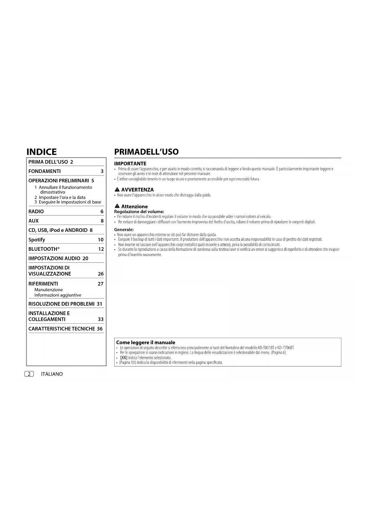 FONDAMENTI 3 OPERAZIONI PRELIMINARI 5 1 Annullare il funzionamento dimostrativo 2 Impostare l’ora e la data 3 Eseguire le impostazioni di base RADIO 6 AUX 8 CD, USB, iPod e ANDROID 8 Spotify 10 BLUETOOTH® 12 IMPOSTAZIONI AUDIO 20 IMPOSTAZIONI DI VISUALIZZAZIONE 26 RIFERIMENTI 27 Manutenzione Informazioni aggiuntive