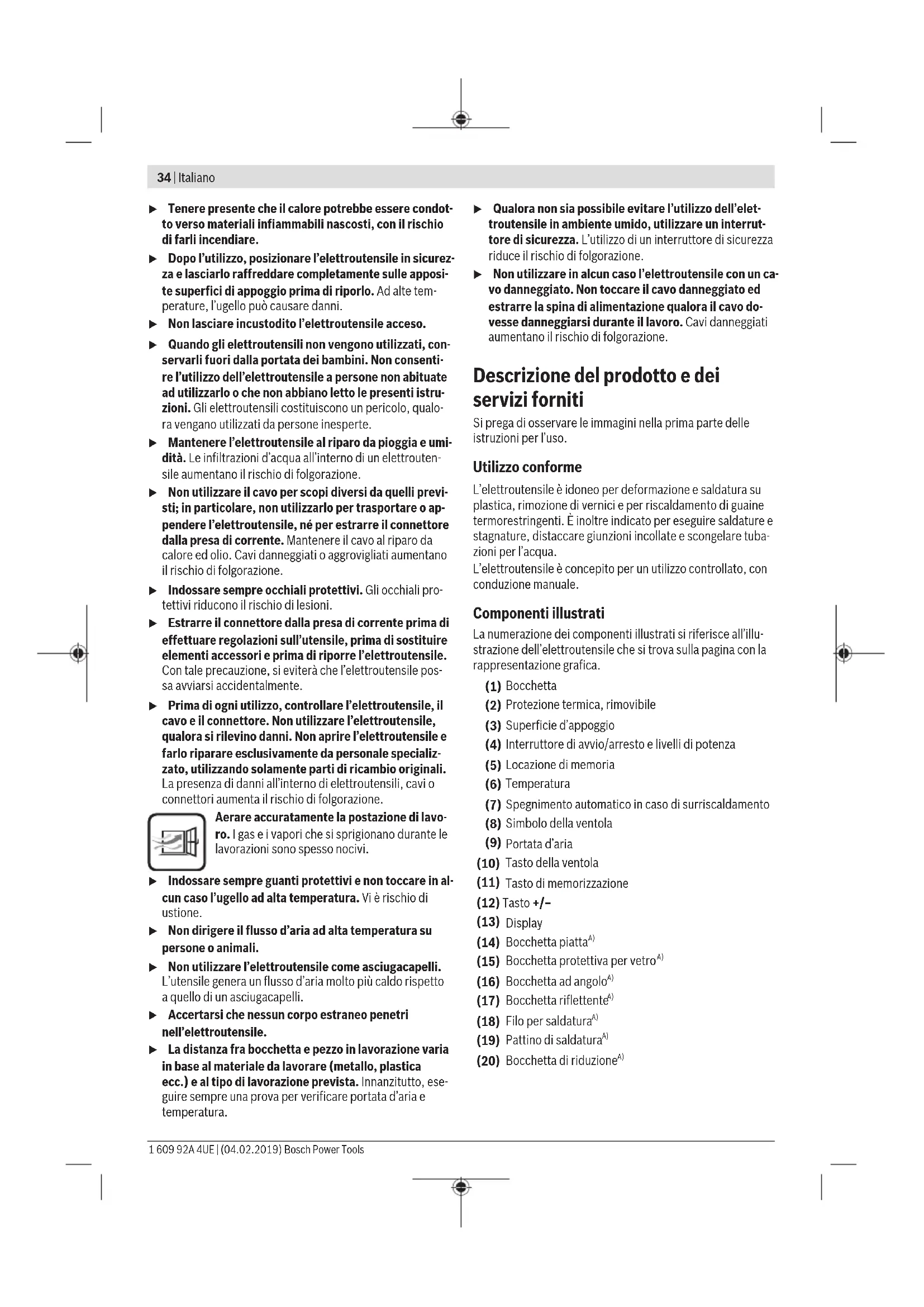 L’accessorio illustrato oppure descritto non è compreso nel volume di fornitura standard. L’accessorio completo è con- tenuto nel nostro programma accessori. Dati tecnici Termosoffiatore GHG 20-63 GHG 23-66 Codice articolo 3 601 BA6 2.. 3 601 BA6 3.. Potenza assorbita nominale W 2000 2100 (2300