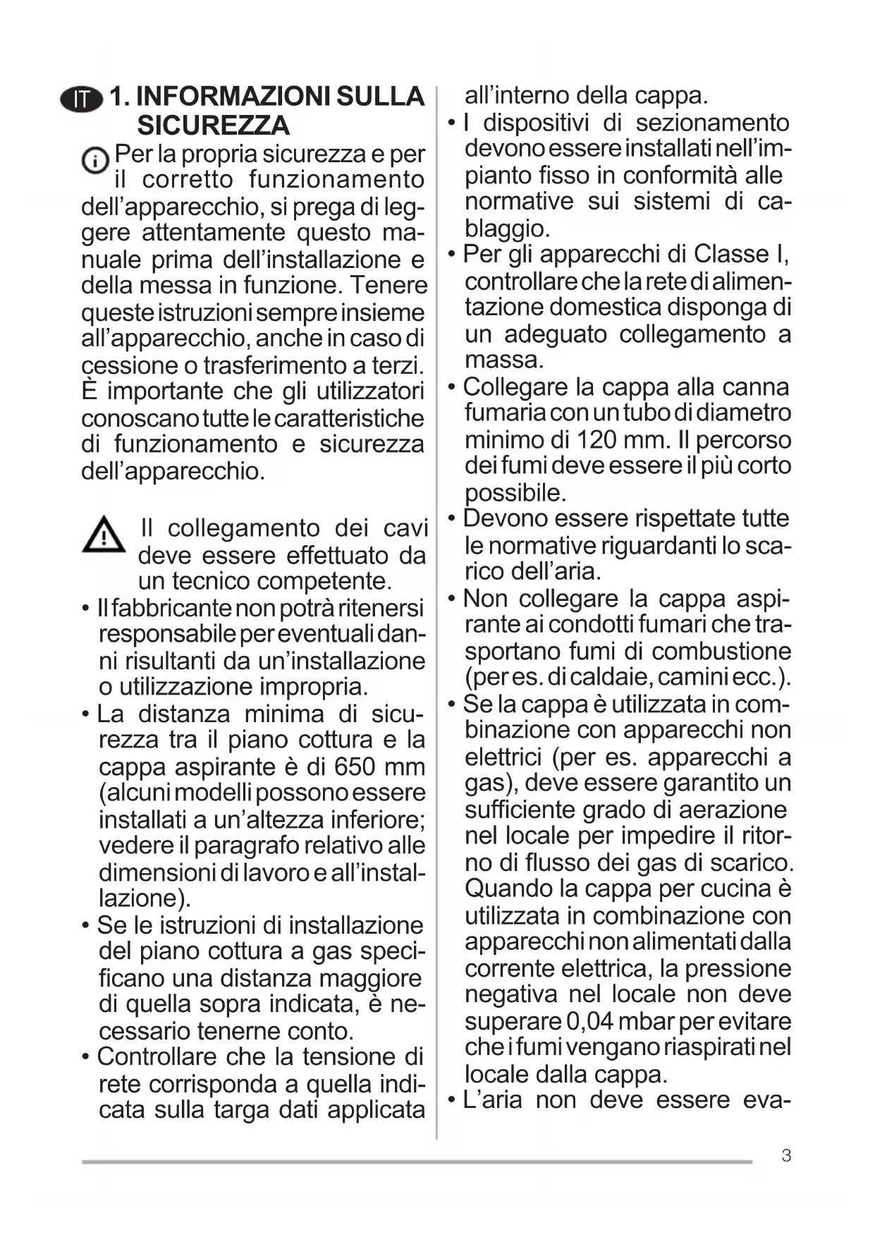 - Relativamente alle misure tecniche e di sicurezza da adottare per lo scarico dei fumi è importante attenersi scrupolo- samente ai regolamenti stabiliti dalle autorità locali. AVVERTENZA: prima di installare la cappa, rimuove- re le pellicole di protezione.