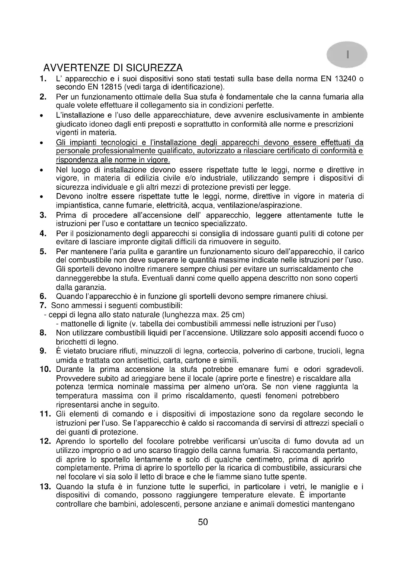 Non è ammesso il collegamento ad una canna fumaria con altezza utile inferiore ai 4 metri. In caso di incendio della canna fumaria chiudere subito tutte le aperture dell’apparecchio e avvertire i Vigili del Fuoco. Non provare in nessun caso a spegnerlo autonomamente. Dopo l’incendio è assolutamente necessario far ispezionare la canna fumaria da un tecnico specializzato.