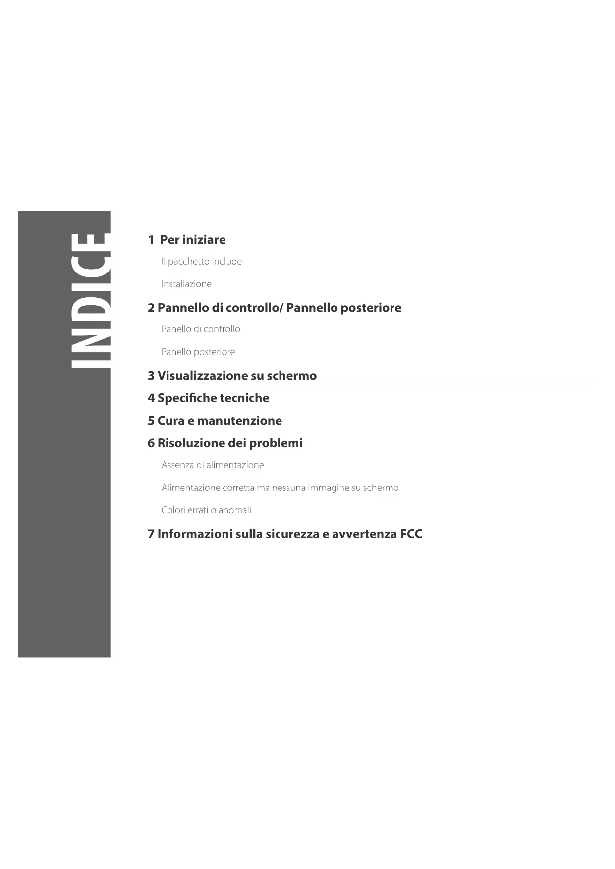 L238E Monitor LED da 23.8” Full HDINDICE 1 Per iniziare Il pacchetto include Installazione 2 Pannello di controllo/ Pannello posteriore Panello di controllo Panello posteriore 3 Visualizzazione su schermo 4 Speciche tecniche 5 Cura e manutenzione 6 Risoluzione dei problemi Assenza di alimentazione Alimentazione corretta ma nessuna immagine su schermo Colori errati o anomali 7 Informazioni sulla sicurezza e avvertenza FCC1 PER INIZIARE Il pacchetto include