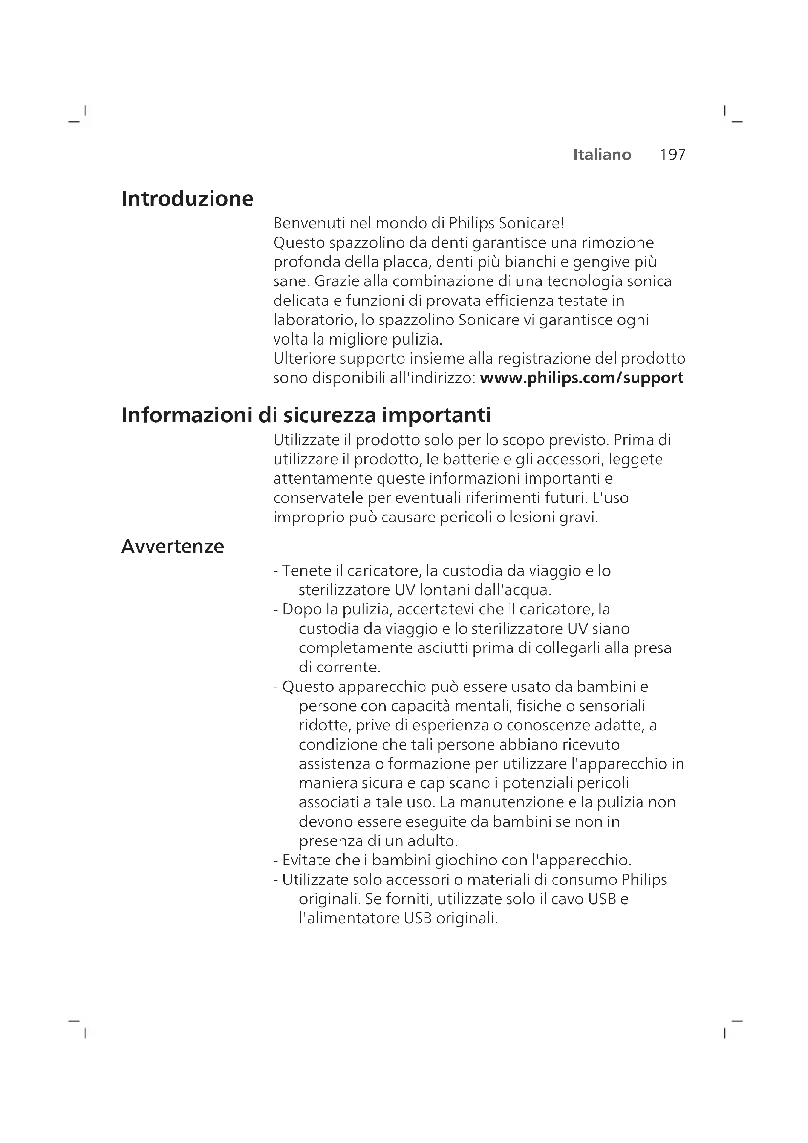 Italiano Introduzione Benvenuti nel mondo di Philips Sonicare! Questo spazzolino da denti garantisce una rimozione profonda della placca, denti più bianchi e gengive più sane. Grazie alla combinazione di una tecnologia sonica delicata e funzioni di provata efficienza testate in laboratorio, lo spazzolino Sonicare vi garantisce ogni volta la migliore pulizia. Ulteriore supporto insieme alla registrazione del prodotto sono disponibili all'indirizzo: www.philips.com/support Informazioni di sicurezza importanti Utilizzate il prodotto solo per lo scopo previsto. Prima di utilizzare il prodotto, le batterie e gli accessori, leggete attentamente queste informazioni importanti e conservatele per eventuali riferimenti futuri. L'uso improprio può causare pericoli o lesioni gravi. Avvertenze - Tenete il caricatore, la custodia da viaggio e lo sterilizzatore UV lontani dall'acqua. - Dopo la pulizia, accertatevi che il caricatore, la custodia da viaggio e lo sterilizzatore UV siano completamente asciutti prima di collegarli alla presa di corrente. - Questo apparecchio può essere usato da bambini e persone con capacità mentali, fisiche o sensoriali ridotte, prive di esperienza o conoscenze adatte, a condizione che tali persone abbiano ricevuto assistenza o formazione per utilizzare l'apparecchio in maniera sicura e capiscano i potenziali pericoli associati a tale uso. La manutenzione e la pulizia non devono essere eseguite da bambini se non in presenza di un adulto. - Evitate che i bambini giochino con l'apparecchio. - Utilizzate solo accessori o materiali di consumo Philips originali. Se forniti, utilizzate solo il cavo USB e l'alimentatore USB originali.198 Italiano - Questo apparecchio non contiene parti riparabili dall'utente. Se l'apparecchio è danneggiato, smettete di utilizzarlo e contattate il Centro Assistenza Clienti del vostro Paese (vedere "Garanzia e assistenza"). - Se il cavo USB o l'alimentatore USB risultano danneggiati, smettete di utilizzarli. - Non usate il caricatore, la custodia da viaggio e/o lo sterilizzatore UV all'aperto o in prossimità di superfici calde. - Non lavate i componenti del prodotto in lavastoviglie. - Questo apparecchio è destinato esclusivamente alla pulizia di denti, gengive e lingua. - Tenete sempre lo sterilizzatore UV fuori dalla portata dei bambini. - Se la lampadina/il LED UV rimane acceso quando lo sterilizzatore UV è aperto, interrompete l'uso di quest'ultimo. i raggi UV potrebbero essere nocivi per gli occhi e la pelle. - Utilizzate l'igienizzatore solo con lo schermo protettivo installato. - Non toccate la lampadina a raggi UV dell'igienizzatore UV se incandescente. - Non utilizzate l'apparecchio in presenza di setole rovinate o piegate. Sostituite la testina dello spazzolino ogni3 mesi o prima in presenza di segni di usura. - Evitate il contatto diretto con prodotti contenenti oli essenziali o olio di cocco. Potrebbe verificarsi il distacco delle setole. - L'altitudine massima di utilizzo è di 4.500 metri.