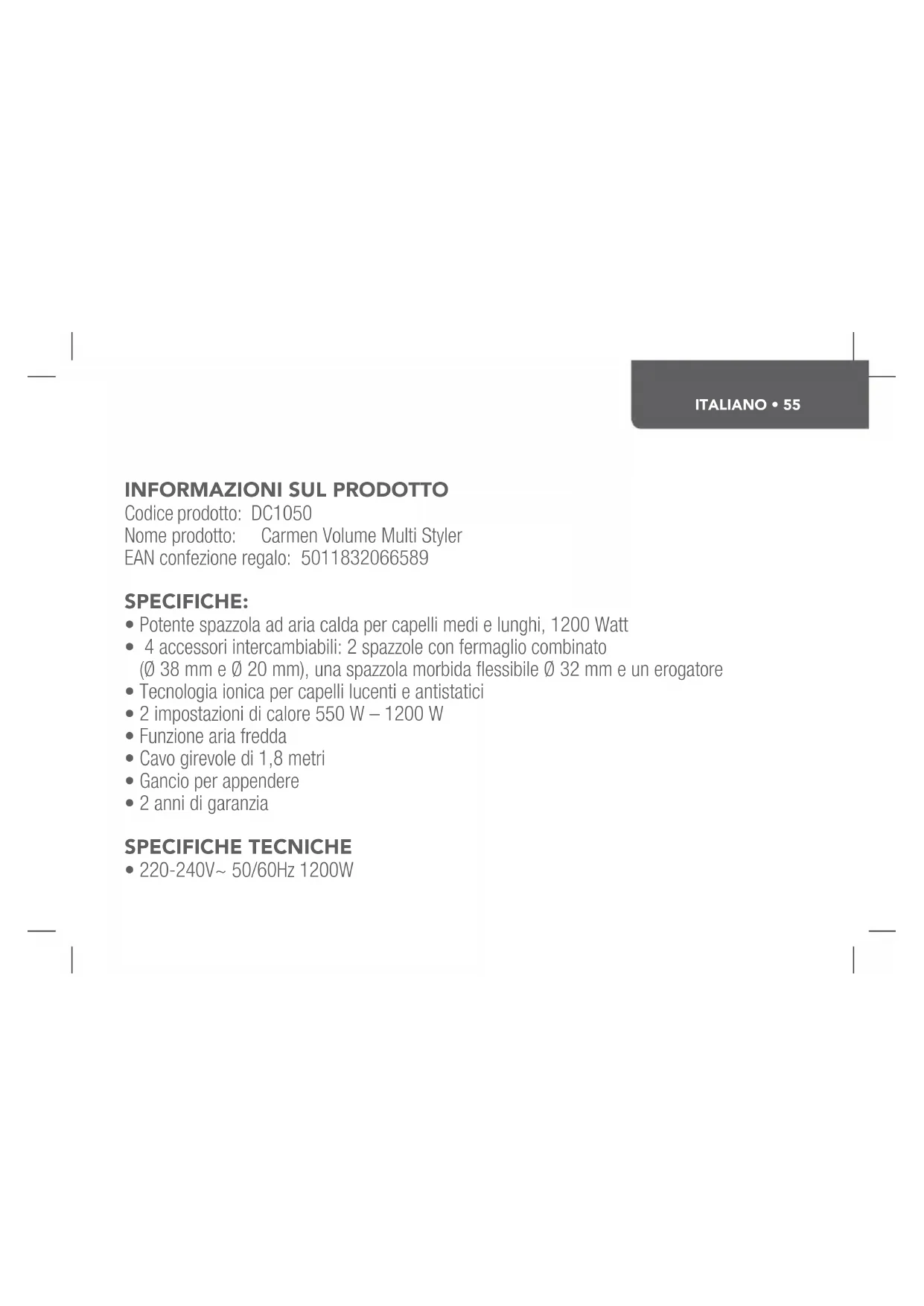 Trova gratuitamente il manuale del dispositivo Volume Multi Styler DC1050 Carmen in formato PDF.