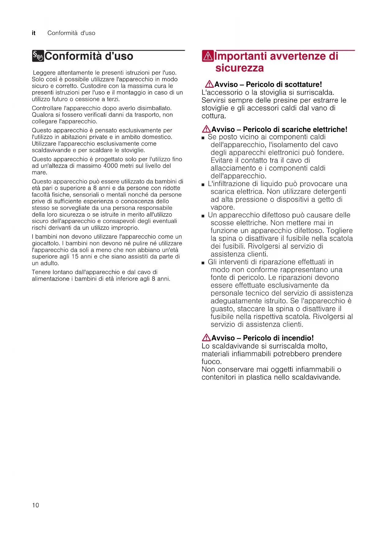8Conformità d'uso Co n f o r mità d' uso Leggere attentamente le presenti istruzioni per l'uso. Solo così è possibile utilizzare l'apparecchio in modo sicuro e corretto. Custodire con la massima cura le presenti istruzioni per l'uso e il montaggio in caso di un utilizzo futuro o cessione a terzi. Controllare l'apparecchio dopo averlo disimballato. Qualora si fossero verificati danni da trasporto, non collegare l'apparecchio. Questo apparecchio è pensato esclusivamente per l'utilizzo in abitazioni private e in ambito domestico. Utilizzare l'apparecchio esclusivamente come scaldavivande e per scaldare le stoviglie. Questo apparecchio è progettato solo per l'utilizzo fino ad un'altezza di massimo 4000metri sul livello del mare. Questo apparecchio può essere utilizzato da bambini di età pari o superiore a 8 anni e da persone con ridotte facoltà fisiche, sensoriali o mentali nonché da persone prive di sufficiente esperienza o conoscenza dello stesso se sorvegliate da una persona responsabile della loro sicurezza o se istruite in merito all'utilizzo sicuro dell'apparecchio e consapevoli degli eventuali rischi derivanti da un utilizzo improprio. I bambini non devono utilizzare l'apparecchio come un giocattolo. I bambini non devono né pulire né utilizzare l'apparecchio da soli a meno che non abbiano un'età superiore agli 15 anni e che siano assistiti da parte di un adulto. Tenere lontano dall'apparecchio e dal cavo di alimentazione i bambini di età inferiore agli 8 anni. (Importanti avvertenze di sicurezza Impor t ant i avv er t enze di si cur ezza :Avviso – Pericolo di scottature! L'accessorio o la stoviglia si surriscalda. Servirsi sempre delle presine per estrarre le stoviglie e gli accessori caldi dal vano di cottura. :Avviso – Pericolo di scariche elettriche! ■ Se posto vicino ai componenti caldi dell'apparecchio, l'isolamento del cavo degli apparecchi elettronici può fondere. Evitare il contatto tra il cavo di allacciamento e i componenti caldi dell'apparecchio. Pericolo di scariche elettriche! ■ L'infiltrazione di liquido può provocare una scarica elettrica. Non utilizzare detergenti ad alta pressione o dispositivi a getto di vapore. Pericolo di scariche elettriche! ■ Un apparecchio difettoso può causare delle scosse elettriche. Non mettere mai in funzione un apparecchio difettoso. Togliere la spina o disattivare il fusibile nella scatola dei fusibili. Rivolgersi al servizio di assistenza clienti. Pericolo di scossa elettrica! ■ Gli interventi di riparazione effettuati in modo non conforme rappresentano una fonte di pericolo. Le riparazioni devono essere effettuate esclusivamente da personale tecnico del servizio di assistenza adeguatamente istruito. Se l'apparecchio è guasto, staccare la spina o disattivare il fusibile nella rispettiva scatola. Rivolgersi al servizio di assistenza clienti. :Avviso – Pericolo di incendio! Lo scaldavivande si surriscalda molto, materiali infiammabili potrebbero prendere fuoco. Non conservare mai oggetti infiammabili o contenitori in plastica nello scaldavivande.Conoscere l'apparecchio it