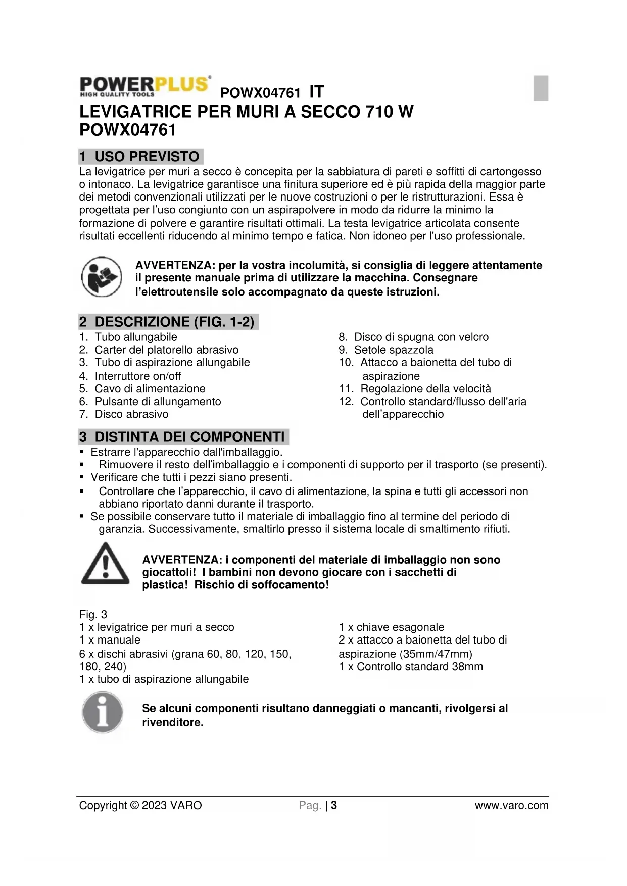 - Se possibile conservare tutto il materiale di imballaggio fino al termine del periodo di garanzia. Successivamente, smaltirlo presso il sistema locale di smaltimento rifiuti. AVVERTENZA: i componenti del materiale di imballaggio non sono giocattoli! I bambini non devono giocare con i sacchetti di plastica! Rischio di soffocamento! Fig. 3 1 x levigatrice per muri a secco 1 x manuale 6 x dischi abrasivi (grana 60, 80, 120, 150, 180, 240) 1 x tubo di aspirazione allungabile 1 x chiave esagonale 2 x attacco a baionetta del tubo di aspirazione (35mm/47mm) 1 x Controllo standard 38mm Se alcuni componenti risultano danneggiati o mancanti, rivolgersi al rivenditore.POWX04761 IT Copyright © 2023 VARO Pag. | 4 www.varo.com 4 SIMBOLI Nel presente manuale e/o sull’apparecchio sono utilizzati i seguenti simboli: