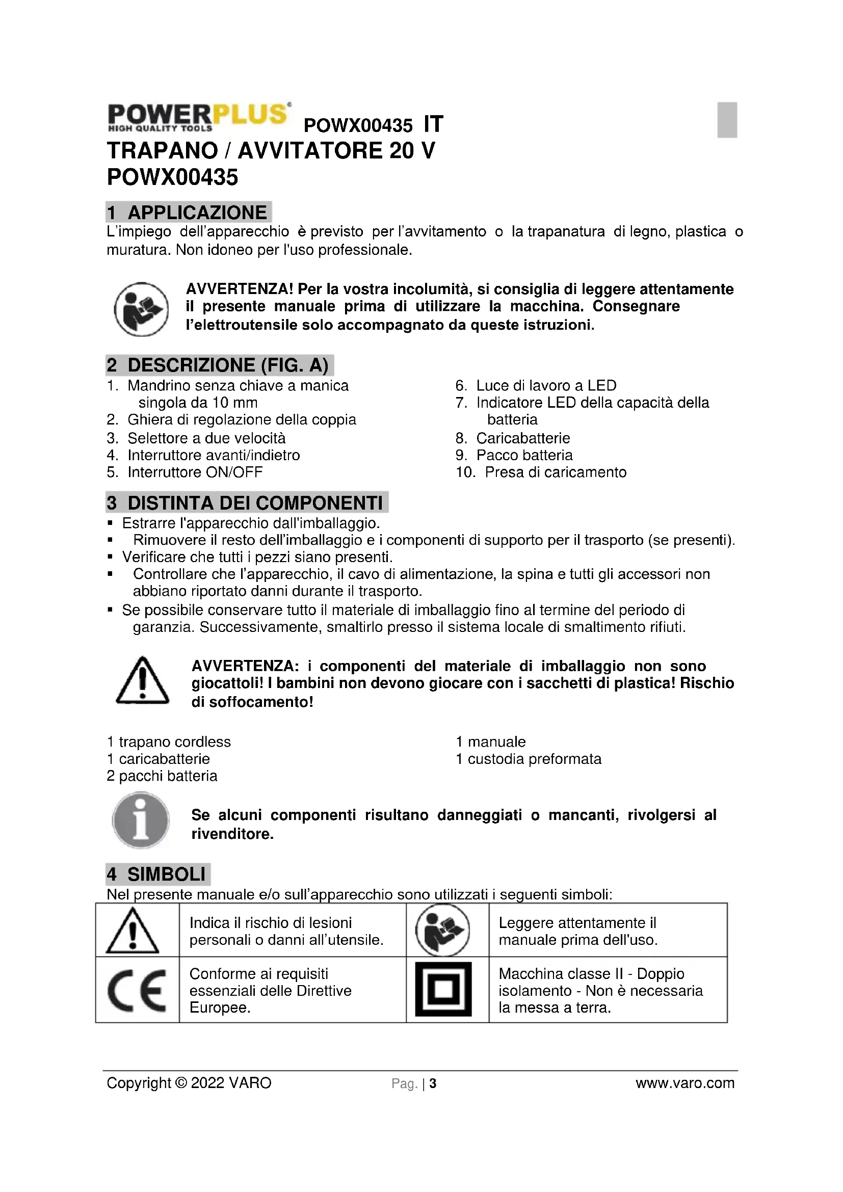 Con la presente, VARO N.V. – Vic. Van Rompuy N.V Joseph Van Instraat 9 – B2500 Lier, Belgio, dichiara che Descrizione dell’apparecchio: Trapano / Avvitatore Marchio: POWERplus Numero articolo: POWX00435 è conforme ai requisiti essenziali e alle altre disposizioni pertinenti stabilite dalle Direttive Europee in base all’applicazione delle norme europee armonizzate. Qualsiasi modifica effettuata sul prodotto rende nulla questa dichiarazione. Direttive europee (inclusi eventuali emendamenti fino alla data della firma): 2011/65/EU 2006/42/EC 2014/30/EU Norme europee armonizzate (inclusi eventuali emendamenti fino alla data della firma): EN62841-1 : 2015 EN62841-2-1 : 2018 EN55014-1:2017 EN55014-2 : 2015 Depositario della documentazione tecnica: Philippe Vankerkhove, VARO – Vic. Van Rompuy N.V. Il sottoscritto agisce in nome e per conto del CEO della società, Ludo Mertens Regulatory Affairs – Compliance Manager 07/01/2022, Lier - BelgiumPOWX00435 PT Copyright © 2022 VARO P á g i n a | 1 www.varo.com 1 APLICAÇÃO.................................................................................... 3