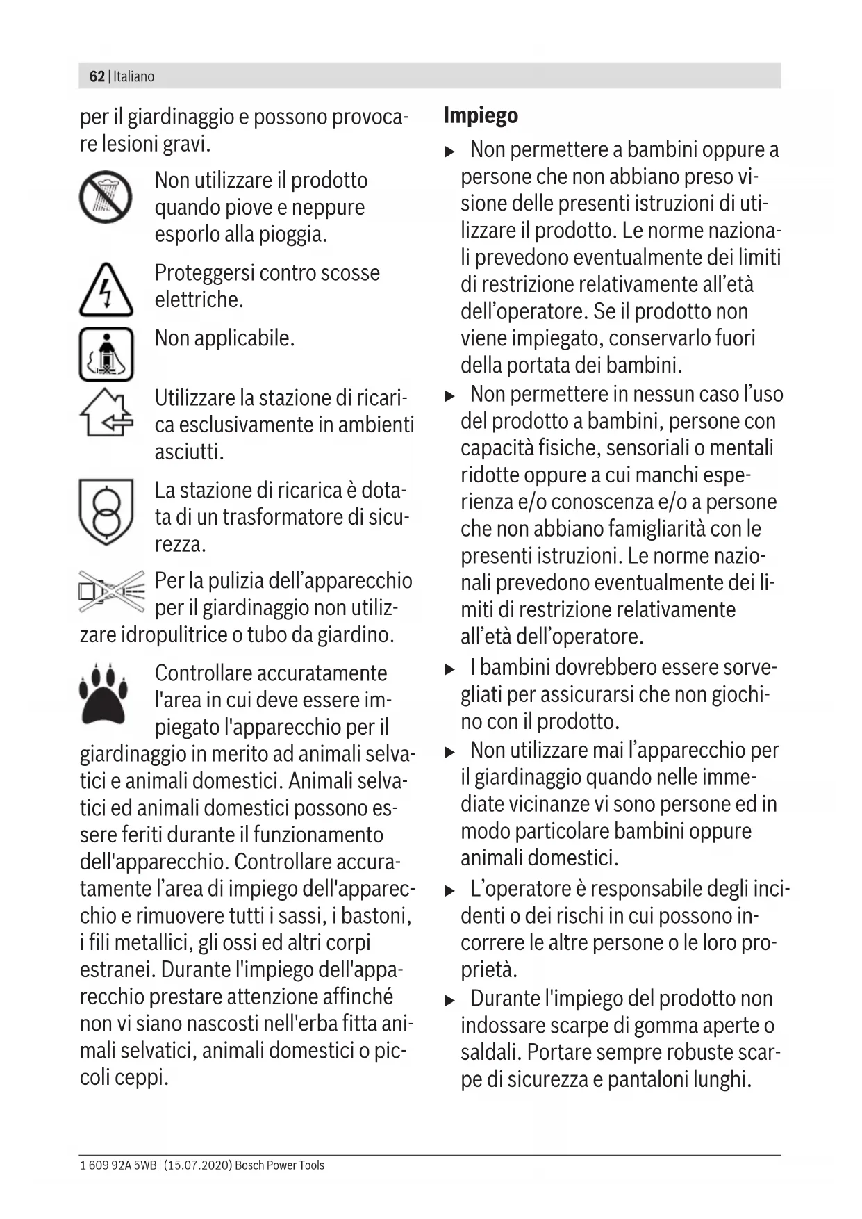 L’accessorio illustrato oppure descritto non è compreso nel volume di fornitura standard. L’accessorio completo è con- tenuto nel nostro programma accessori. Messa in funzione Per la Vostra sicurezza u Attenzione! Spegnere l’apparecchio per il giardinag- gio, rimuovere il ruttore del circuito elettrico e toglie- re la batteria ricaricabile prima di effettuare interven- ti di manutenzione o di pulizia. Lo stesso vale se il cavo dell’interruttore dovesse essere danneggiato, tagliato oppure aggrovigliato. u Le lame continuano a ruotare ancora per alcuni secon- di dopo lo spegnimento dell’apparecchio per il giardi- naggio. u Attenzione: Non toccare la lama di taglio rotante. Ricarica della batteria La batteria ricaricabile è dotata di un controllo della tempe- ratura che consente una ricarica esclusivamente nel campo di temperatura tra 0 °C e 35 °C. In questo modo viene otte- nuta un’elevata durata della batteria ricaricabile. Nota: La batteria ricaricabile viene fornita parzialmente cari- ca. Per garantire l’intera potenza della batteria ricaricabile, prima del primo impiego ricaricare completamente la batte- ria ricaricabile nella stazione di ricarica. La batteria ricaricabile agli ioni di litio può essere ricaricata in qualsiasi momento senza ridurne la durata. Un’interruzio- ne dell’operazione di ricarica non danneggia la batteria rica- ricabile. La batteria ricaricabile agli ioni di litio è protetta dalla "Elec- tronic Cell Protection (ECP)" contro lo scaricamento comple- to. In caso di batteria scarica, il prodotto viene spento trami- te un interruttore automatico: L’apparecchio per il giardinag- gio non funziona più. Dopo lo spegnimento automatico del prodotto non pre- mere ulteriormente l’interruttore di avvio/arresto. La batteria ricaricabile potrebbe subire dei danni. Attenersi alle indicazioni per lo smaltimento della batteria ri- caricabile. Inserimento/rimozione della batteria ricaricabile Nota: Se non vengono utilizzate batterie ricaricabili adatte possono verificarsi funzionamenti difettosi o è possibile il danneggiamento dell’apparecchio. Inserire la batteria carica. Assicurarsi che la batteria ricarica- bile sia inserita completamente. Per la rimozione della batteria ricaricabile dall’apparecchio premere il tasto di sbloccaggio batteria ricaricabile e togliere la batteria. Operazione di ricarica L’operazione di ricarica inizia non appena la spina di rete del- la stazione di ricarica viene inserita nella presa e la batteria ricaricabile viene inserita nella stazione di ricarica . Grazie all’intelligente procedimento di ricarica lo stato di ri- carica della batteria viene riconosciuto automaticamente e, in base alla temperatura della batteria e della tensione, viene selezionata la corrente di carica ottimale. In questo modo la batteria ricaricabile viene protetta e con- servandola nella stazione di ricarica rimane sempre comple- tamente carica. Significato degli elementi indicatori sulla stazione di ricarica (AL 3620 CV/AL 3640 CV/AL 36V-20) Operazione di ricarica rapida L'operazione di ricarica rapida viene segnalata dal lampeggio dell’indicatore di carica della batteria verde. Elemento indicatore sulla batteria ricaricabile: Durante l'ope- razione di ricarica i tre LED verdi sono illuminati uno dopo l’altro e si spengono brevemente. La batteria ricaricabile è completamente carica quando i tre LED verdi sono illuminati permanentemente. Circa 5minuti dopo che la batteria ricari- cabile è stata ricaricata completamente, i tre LED verdi si spengono di nuovo. Nota: L’operazione di ricarica rapida è possibile esclusiva- mente se la temperatura della batteria ricaricabile si trova nel campo di temperatura di carica ammissibile, vedi para- grafo "Dati tecnici". Batteria caricata La luce continua dell’indicatore LED verde se- gnala che la batteria è completamente carica. Inoltre, per la durata di ca. 2 secondi viene emesso un segnale acustico che segnala che la batteria è sta- ta ricaricata completamente. Una volta terminata l’operazione, la batteria ricaricabile può essere estratta ed è pronta per l’uso immediato. Se la batteria ricaricabile non è inserita, la luce continua dell’indicatore LED segnala che la spina di rete è inserita nel- la presa di corrente e che la stazione di ricarica è pronta per l’uso. 1 609 92A 5WB | (15.07.2020) Bosch Power ToolsItaliano | 71 Temperatura della batteria ricaricabile inferiore a 0°C oppure superiore a 45°C La luce continua dell’indicatore LED rosso se- gnala che la temperatura della batteria si trova al di fuori del campo di temperatura di carica ammissibile, vedi paragrafo "Dati tecnici". Non appena viene raggiunto il campo di temperatura ammissibile, la stazione di ricarica passa automaticamente alla ricarica rapida. Se la temperatura della batteria ricaricabile si trova al di fuo- ri del campo di temperatura di carica ammissibile, inseren- dola nella stazione di ricarica si accende il LED rosso della batteria ricaricabile. Operazione di ricarica impossibile Nel caso fosse presente un'altra anomalia dell’operazione di ricarica, la stessa viene se- gnalata tramite lampeggio dell’indicatore LED rosso. L’operazione di ricarica non può essere avviata e la ricarica della batteria non è possibile (vedi paragrafo "Individuazione dei guasti"). Istruzioni per la ricarica In caso di cicli di ricarica continui oppure in caso di operazio- ni di ricarica successivi senza interruzione, la stazione di ri- carica si può riscaldare. Questo fatto non è comunque preoc- cupante e non è indice di un difetto tecnico della stazione di ricarica stessa. Un tempo di funzionamento notevolmente ridotto dopo la ri- carica indica che la batteria ricaricabile è consumata e deve essere sostituita. Attenersi alle indicazioni per lo smaltimento. Raffreddamento della batteria ricaricabile (Active Air Cooling) Il sistema di ventilazione integrato nella stazione di ricarica controlla la temperatura 