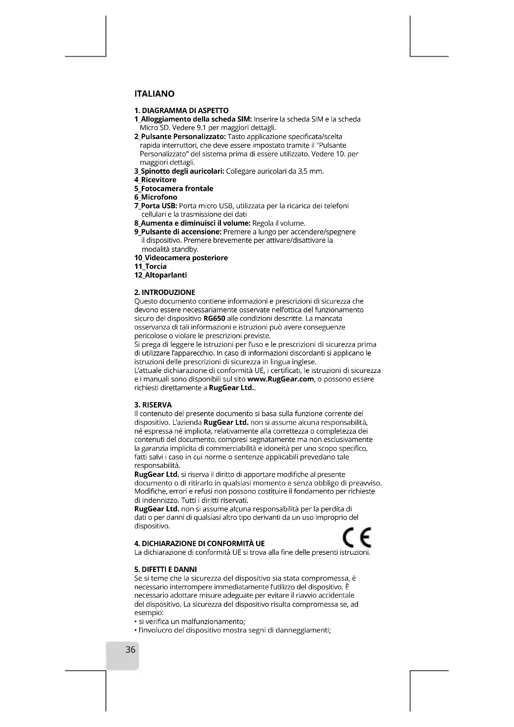 Questo documento contiene informazioni e prescrizioni di sicurezza che devono essere necessariamente osservate nell’ottica del funzionamento sicuro del dispositivo RG650 alle condizioni descritte. La mancata osservanza di tali informazioni e istruzioni può avere conseguenze pericolose o violare le prescrizioni previste. Si prega di leggere le istruzioni per l’uso e le prescrizioni di sicurezza prima di utilizzare l’apparecchio. In caso di informazioni discordanti si applicano le istruzioni delle prescrizioni di sicurezza in lingua inglese. L’attuale dichiarazione di conformità UE, i certificati, le istruzioni di sicurezza e i manuali sono disponibili sul sito www.RugGear.com, o possono essere richiesti direttamente a RugGear Ltd..