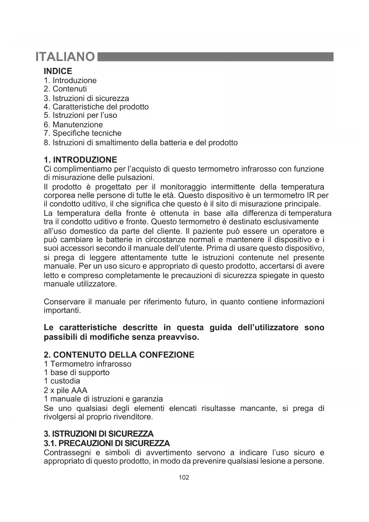 Ci complimentiamo per l’acquisto di questo termometro infrarosso con funzione di misurazione delle pulsazioni. Il prodotto è progettato per il monitoraggio intermittente della temperatura corporea nelle persone di tutte le età. Questo dispositivo è un termometro IR per il condotto uditivo, il che signica che questo è il sito di misurazione principale. La temperatura della fronte è ottenuta in base alla differenza di temperatura tra il condotto uditivo e fronte. Questo termometro è destinato esclusivamente all’uso domestico da parte del cliente. Il paziente può essere un operatore e può cambiare le batterie in circostanze normali e mantenere il dispositivo e i suoi accessori secondo il manuale dell’utente. Prima di usare questo dispositivo, si prega di leggere attentamente tutte le istruzioni contenute nel presente manuale. Per un uso sicuro e appropriato di questo prodotto, accertarsi di avere letto e compreso completamente le precauzioni di sicurezza spiegate in questo manuale utilizzatore. Conservare il manuale per riferimento futuro, in quanto contiene informazioni importanti. Le caratteristiche descritte in questa guida dell’utilizzatore sono passibili di modiche senza preavviso.