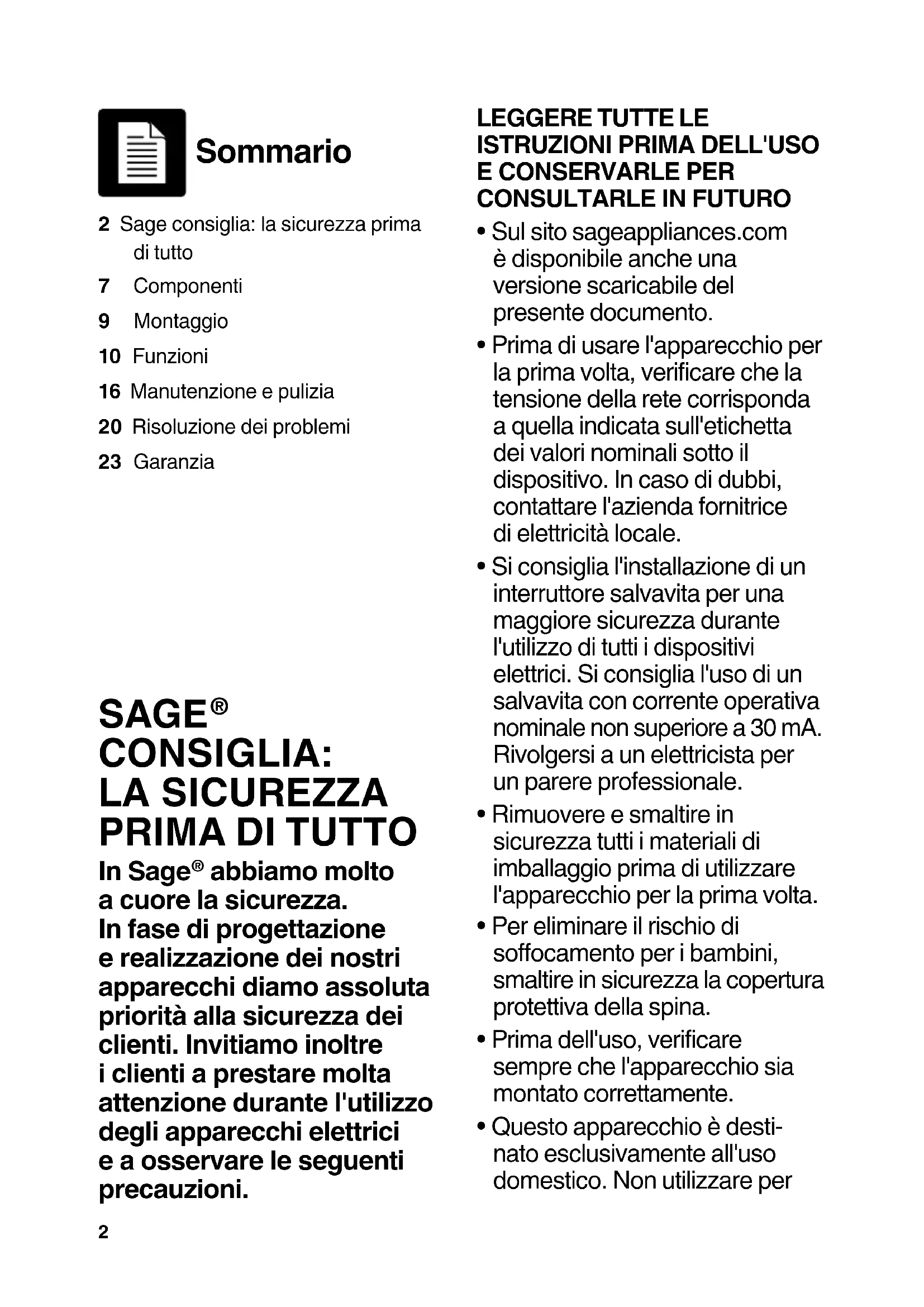 abbiamo molto a cuore la sicurezza. In fase di progettazione e realizzazione dei nostri apparecchi diamo assoluta priorità alla sicurezza dei clienti. Invitiamo inoltre i clienti a prestare molta attenzione durante l'utilizzo degli apparecchi elettrici e a osservare le seguenti precauzioni. Sommario 2 Sage consiglia: la sicurezza prima di tutto7 Componenti9 Montaggio10 Funzioni16 Manutenzione e pulizia20 Risoluzione dei problemi23 Garanzia3