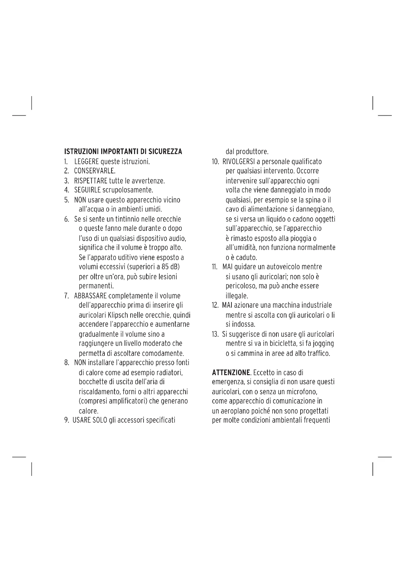 dell’apparecchio prima di inserire gli auricolari Klipsch nelle orecchie, quindi accendere l’apparecchio e aumentarne gradualmente il volume sino a raggiungere un livello moderato che permetta di ascoltare comodamente.