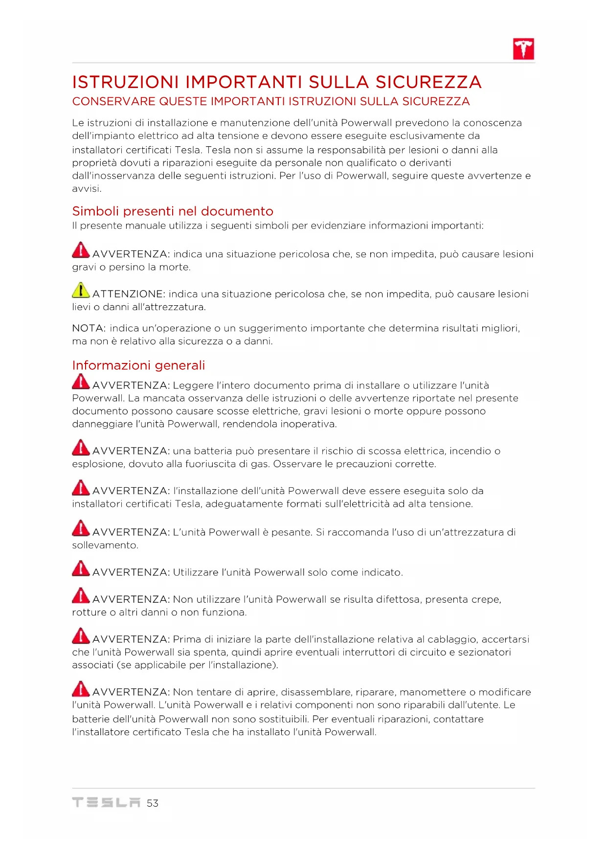 Le istruzioni di installazione e manutenzione dell'unità Powerwall prevedono la conoscenza dell'impianto elettrico ad alta tensione e devono essere eseguite esclusivamente da installatori certificati Tesla. Tesla non si assume la responsabilità per lesioni o danni alla proprietà dovuti a riparazioni eseguite da personale non qualificato o derivanti dall'inosservanza delle seguenti istruzioni. Per l'uso di Powerwall, seguire queste avvertenze e avvisi. Simboli presenti nel documento Il presente manuale utilizza i seguenti simboli per evidenziare informazioni importanti: AVVERTENZA: indica una situazione pericolosa che, se non impedita, può causare lesioni gravi o persino la morte. ATTENZIONE: indica una situazione pericolosa che, se non impedita, può causare lesioni lievi o danni all'attrezzatura. NOTA: indica un'operazione o un suggerimento importante che determina risultati migliori, ma non è relativo alla sicurezza o a danni. Informazioni generali AVVERTENZA: Leggere l'intero documento prima di installare o utilizzare l'unità Powerwall. La mancata osservanza delle istruzioni o delle avvertenze riportate nel presente documento possono causare scosse elettriche, gravi lesioni o morte oppure possono danneggiare l'unità Powerwall, rendendola inoperativa. AVVERTENZA: una batteria può presentare il rischio di scossa elettrica, incendio o esplosione, dovuto alla fuoriuscita di gas. Osservare le precauzioni corrette. AVVERTENZA: l'installazione dell'unità Powerwall deve essere eseguita solo da installatori certificati Tesla, adeguatamente formati sull'elettricità ad alta tensione. AVVERTENZA: L'unità Powerwall è pesante. Si raccomanda l'uso di un'attrezzatura di sollevamento. AVVERTENZA: Utilizzare l'unità Powerwall solo come indicato. AVVERTENZA: Non utilizzare l'unità Powerwall se risulta difettosa, presenta crepe, rotture o altri danni o non funziona. AVVERTENZA: Prima di iniziare la parte dell'installazione relativa al cablaggio, accertarsi che l'unità Powerwall sia spenta, quindi aprire eventuali interruttori di circuito e sezionatori associati (se applicabile per l'installazione). AVVERTENZA: Non tentare di aprire, disassemblare, riparare, manomettere o modificare l'unità Powerwall. L'unità Powerwall e i relativi componenti non sono riparabili dall'utente. Le batterie dell'unità Powerwall non sono sostituibili. Per eventuali riparazioni, contattare l'installatore certificato Tesla che ha installato l'unità Powerwall.54 Manuale d’uso Powerwall AVVERTENZA: Per proteggere Powerwall e i relativi componenti da danni durante il trasporto, maneggiarla con cura. Non urtare, tirare, trascinare o salire sull'unità Powerwall. Non sottoporre l'unità Powerwall ad alcuna forza eccessiva. Per impedire eventuali danni, lasciare l'unità Powerwall nel relativo imballaggio di spedizione fino al momento del montaggio. AVVERTENZA: Non inserire oggetti estranei in alcuna parte dell'unità Powerwall. AVVERTENZA: Non esporre l'unità Powerwall o i relativi componenti a fiamme dirette. AVVERTENZA: Non installare l’unità Powerwall in prossimità di apparecchiature di riscaldamento. AVVERTENZA: non immergere l'unità Powerwall o i relativi componenti in acqua o altri fluidi. ATTENZIONE: non utilizzare solventi per pulire l'unità Powerwall né esporla a sostanze chimiche o vapori penetranti o infiammabili. ATTENZIONE: non utilizzare fluidi, parti o accessori diversi da quelli specificati nel presente manuale, incluso l'uso di parti o accessori non originali Tesla, o parti o accessori non acquistati direttamente da Tesla o da terzi certificati Tesla. ATTENZIONE: Non lasciare l'unità Powerwall in condizioni di stoccaggio per più di un (1) mese né lasciare collegata l'alimentazione elettrica per più di un (1) mese senza aver messo l'unità Powerwall in condizioni di stoccaggio conformemente alle specifiche previste da Tesla. ATTENZIONE: Non verniciare alcuna parte dell'unità Powerwall, inclusi componenti esterni o interni quali l'involucro esterno o l'alloggiamento. ATTENZIONE: non collegare l'unità Powerwall direttamente a un impianto fotovoltaico (PV). ATTENZIONE: Se si installa l'unità Powerwall in un garage o accanto a veicoli, posizionarla in modo che non sia di intralcio. Se possibile, installare l'unità Powerwall su una parete laterale e/o a un'altezza superiore al paraurti di un veicolo. Condizioni ambientali AVVERTENZA: Installare l'unità Powerwall in una posizione adeguata per impedire danni dovuti ad allagamento. AVVERTENZA: Il funzionamento o lo stoccaggio dell'unità Powerwall a temperature al di fuori della gamma specificata potrebbe causare danni. AVVERTENZA: Non esporre l'unità Powerwall a temperature ambiente superiori a 60 °C (140 °F) o inferiori a -30 °C (-22 °F). ATTENZIONE: Assicurarsi che non vi siano fonti d'acqua su o accanto l'unità Powerwall, inclusi tubi di scarico, irrigatori o rubinetti. ATTENZIONE: Accertarsi che intorno all'unità Powerwall non si accumuli neve.55