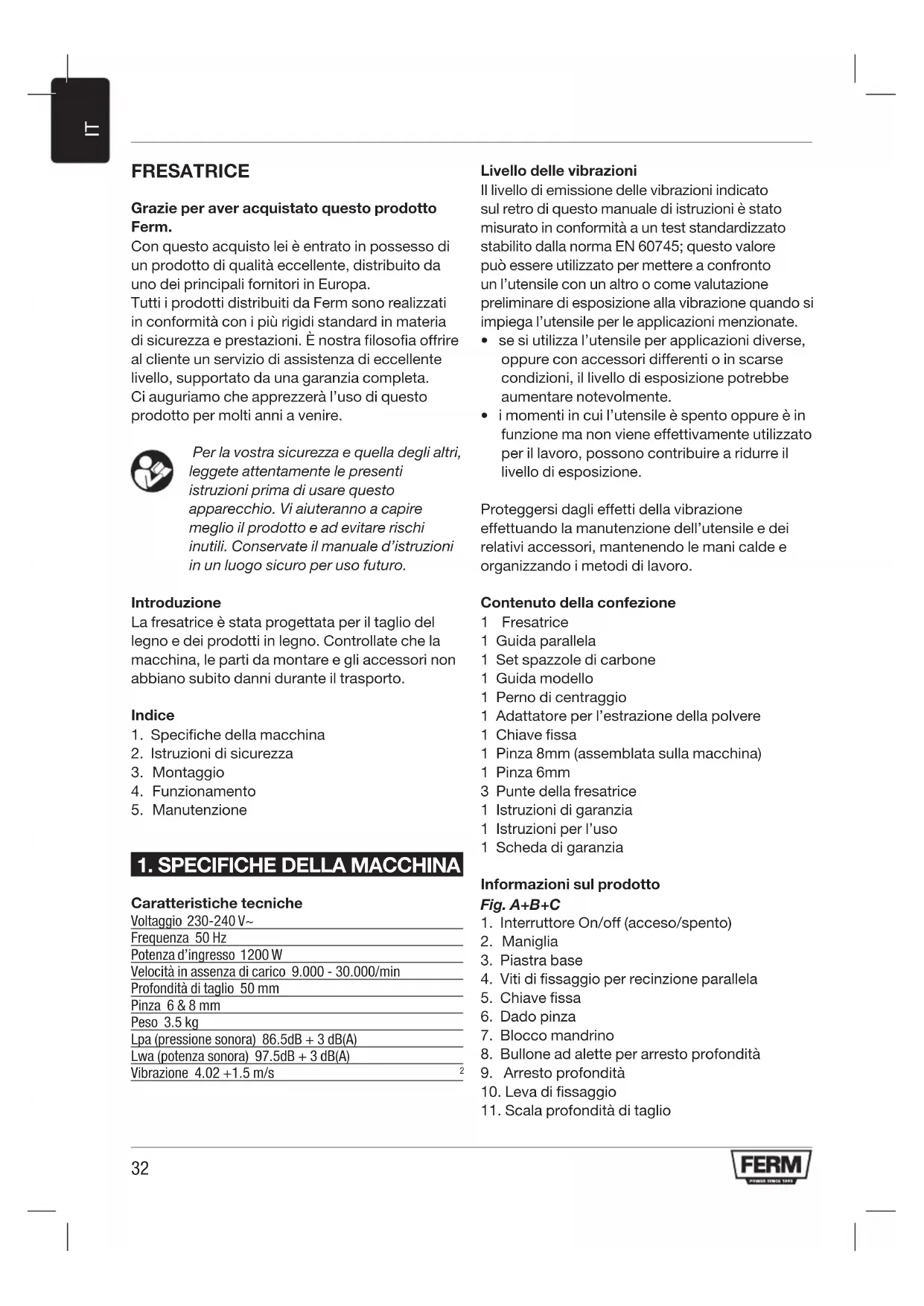 FRESATRICE Grazie per aver acquistato questo prodotto Ferm. Con questo acquisto lei è entrato in possesso di un prodotto di qualità eccellente, distribuito da uno dei principali fornitori in Europa. Tutti i prodotti distribuiti da Ferm sono realizzati in conformità con i più rigidi standard in materia di sicurezza e prestazioni. È nostra filosofia offrire al cliente un servizio di assistenza di eccellente livello, supportato da una garanzia completa. Ci auguriamo che apprezzerà l’uso di questo prodotto per molti anni a venire. Per la vostra sicurezza e quella degli altri, leggete attentamente le presenti istruzioni prima di usare questo apparecchio. Vi aiuteranno a capire meglio il prodotto e ad evitare rischi inutili. Conservate il manuale d’istruzioni in un luogo sicuro per uso futuro. Introduzione La fresatrice è stata progettata per il taglio del legno e dei prodotti in legno. Controllate che la macchina, le parti da montare e gli accessori non abbiano subito danni durante il trasporto. Indice