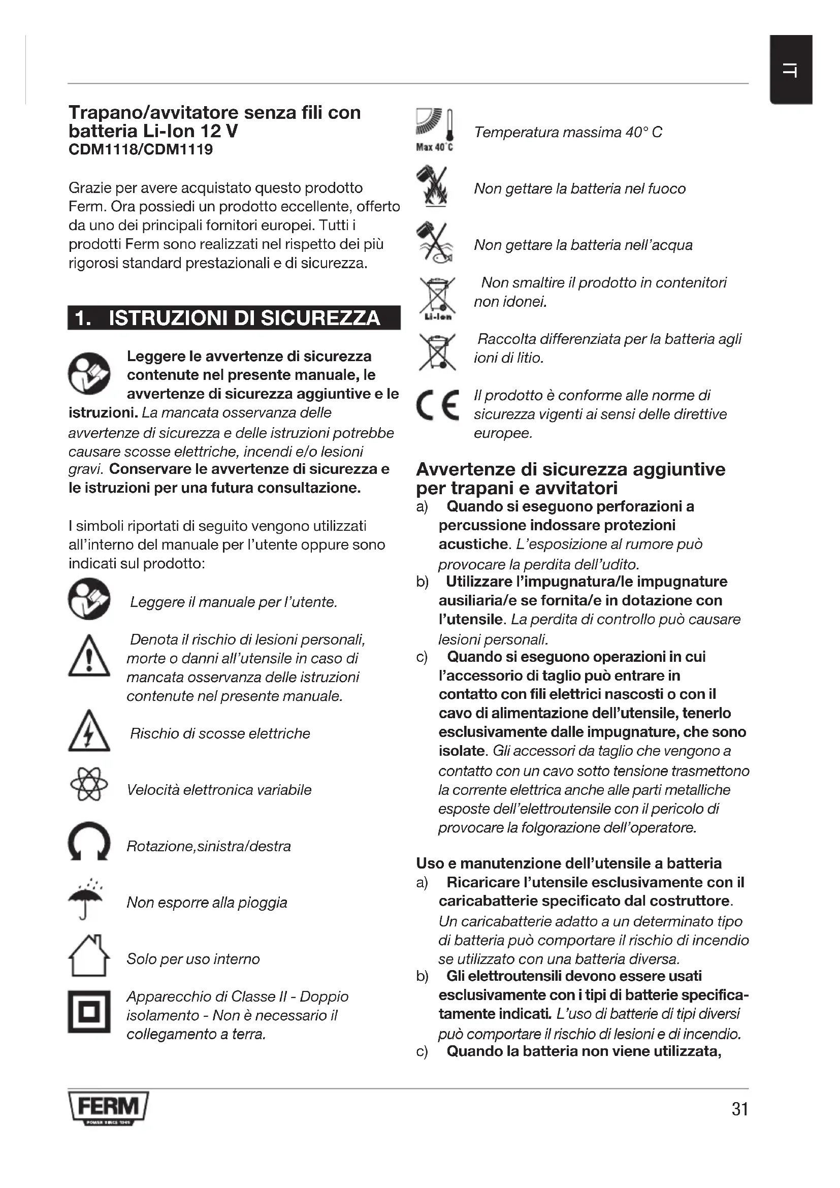 Trapano/avvitatore senza fili con batteria Li-Ion 12 V CDM1118/CDM1119 Grazie per avere acquistato questo prodotto Ferm. Ora possiedi un prodotto eccellente, offerto da uno dei principali fornitori europei. Tutti i prodotti Ferm sono realizzati nel rispetto dei più rigorosi standard prestazionali e di sicurezza.