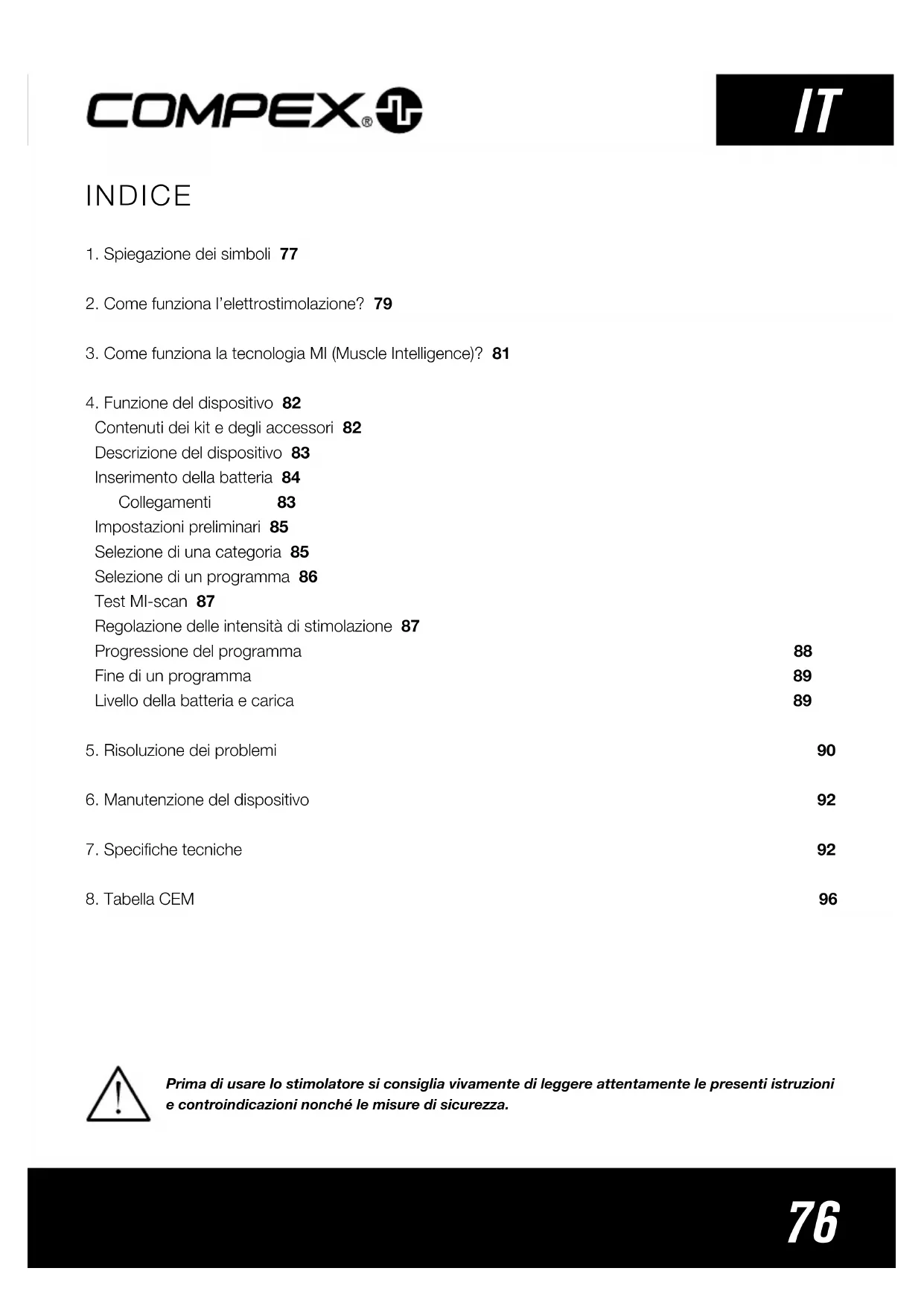 Contenuti dei kit e degli accessori 82 Descrizione del dispositivo 83 Inserimento della batteria 84 Collegamenti 83 Impostazioni preliminari 85 Selezione di una categoria 85 Selezione di un programma 86 Test MI-scan 87 Regolazione delle intensità di stimolazione 87 Progressione del programma 88 Fine di un programma 89 Livello della batteria e carica 89