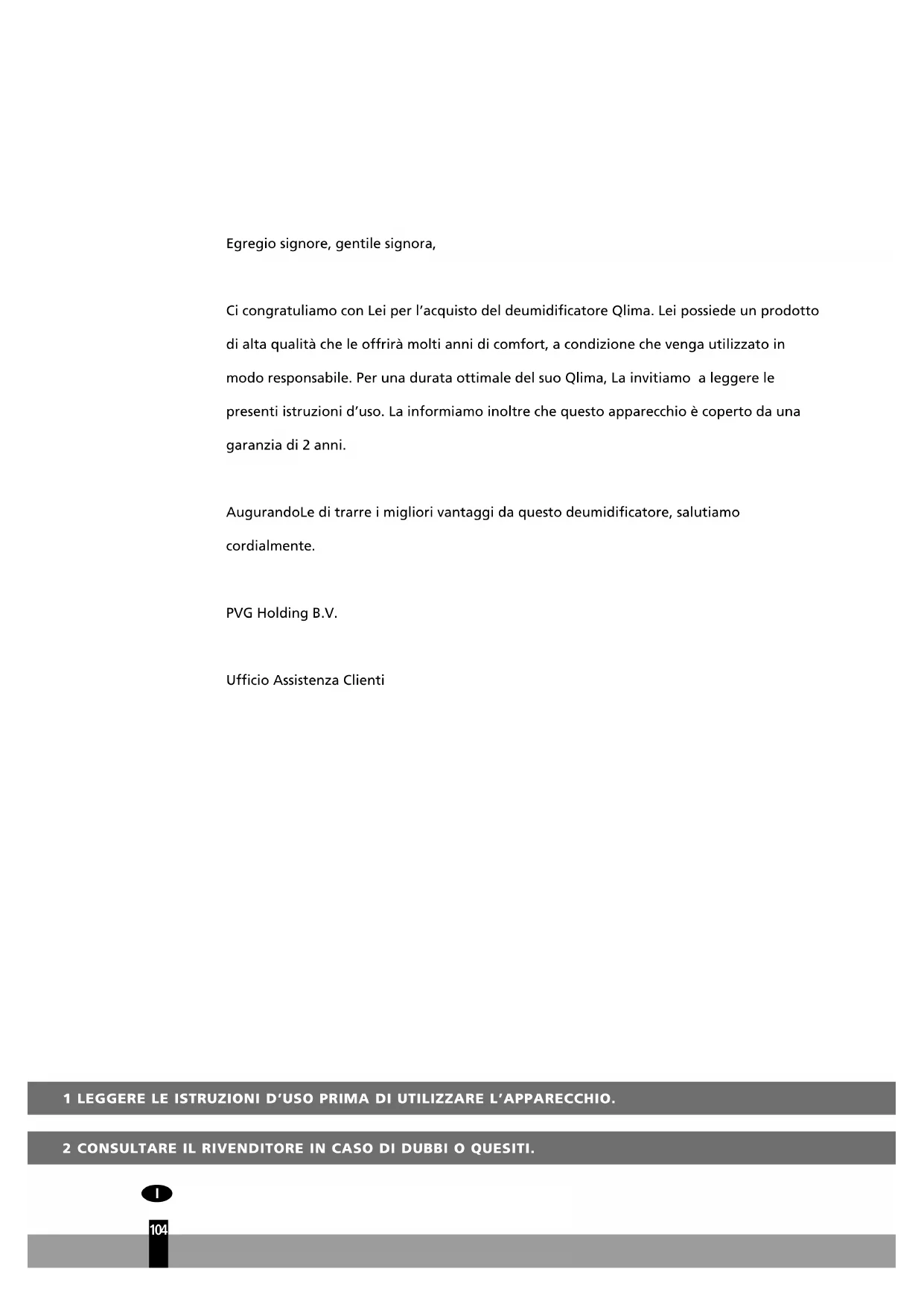 Egregio signore, gentile signora, Ci congratuliamo con Lei per l’acquisto del deumidificatore Qlima. Lei possiede un prodotto di alta qualità che le offrirà molti anni di comfort, a condizione che venga utilizzato in modo responsabile. Per una durata ottimale del suo Qlima, La invitiamo a leggere le presenti istruzioni d’uso. La informiamo inoltre che questo apparecchio è coperto da una garanzia di 2 anni. AugurandoLe di trarre i migliori vantaggi da questo deumidificatore, salutiamo cordialmente. PVG Holding B.V. Ufficio Assistenza ClientiCOMPONENTI PRINCIPALI Copertura anteriore Presa Maniglia Pannello di controllo Cassetta del filtro Copertura posteriore Serbatoio Piedini in gomma Cavo di alimentazione